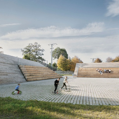 La estructura del edificio se basa en una planta rectangular con una superficie de cubierta torcida. También cumple una función utilitaria a través del diseño de los asientos integrados, que pueden utilizarse tanto durante los eventos al aire libre como gradas, como en el uso cotidiano como lugares de descanso.