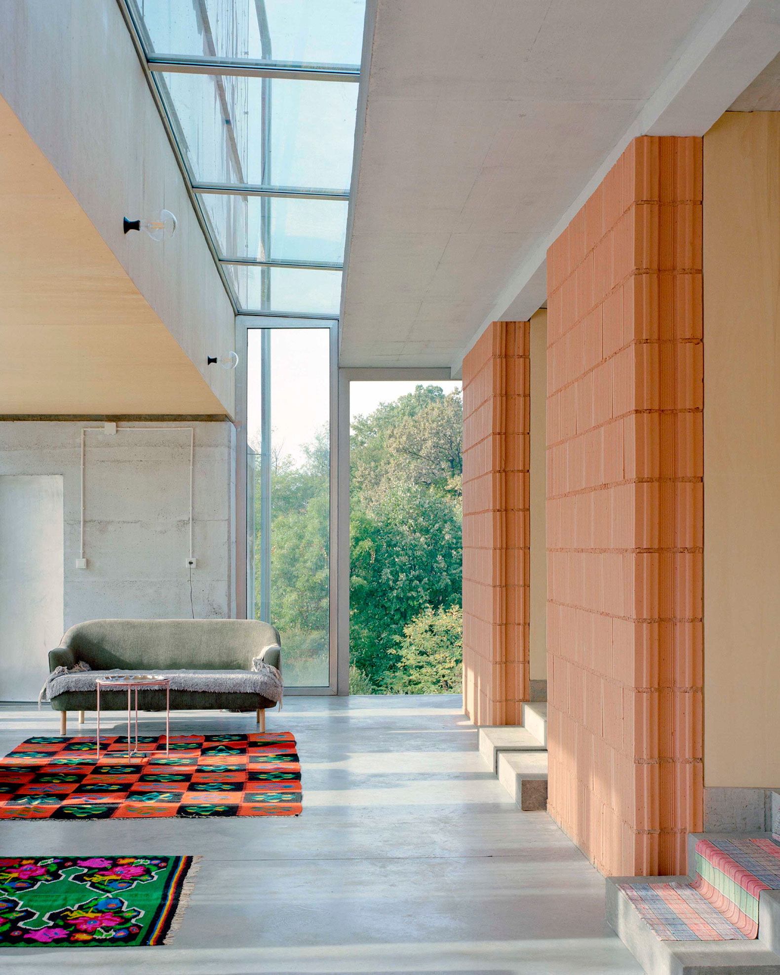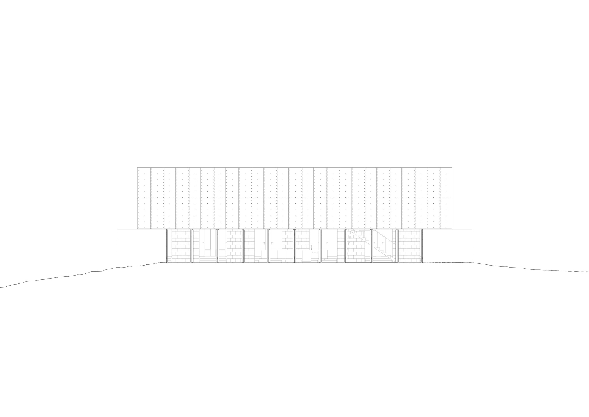 Con aproximadamente 90 m², la zona común es más grande de lo que las personas podrían permitirse de forma independiente y requiere la participación compartida, lo que refuerza la idea de la vida en comunidad. Este espacio expande el concepto de las tradicionales zonas de porche orientadas al sur, proporcionando sombra en verano y creando profundidad. Este tipo de habitación, situada entre el interior y el exterior, funciona como un espacio para la elaboración de alimentos y la interacción social. Abierta por tres lados y con una claraboya que separa las zonas privadas de las amplias zonas comunes, funciona como cocina, área de recepción, espacio de trabajo y sala de estar. Los dos cuartos de servicio en la planta baja son de hormigón e incluyen amplios baños, conectados al paisaje mediante pequeñas puertas que proporcionan acceso directo a la jardinería.