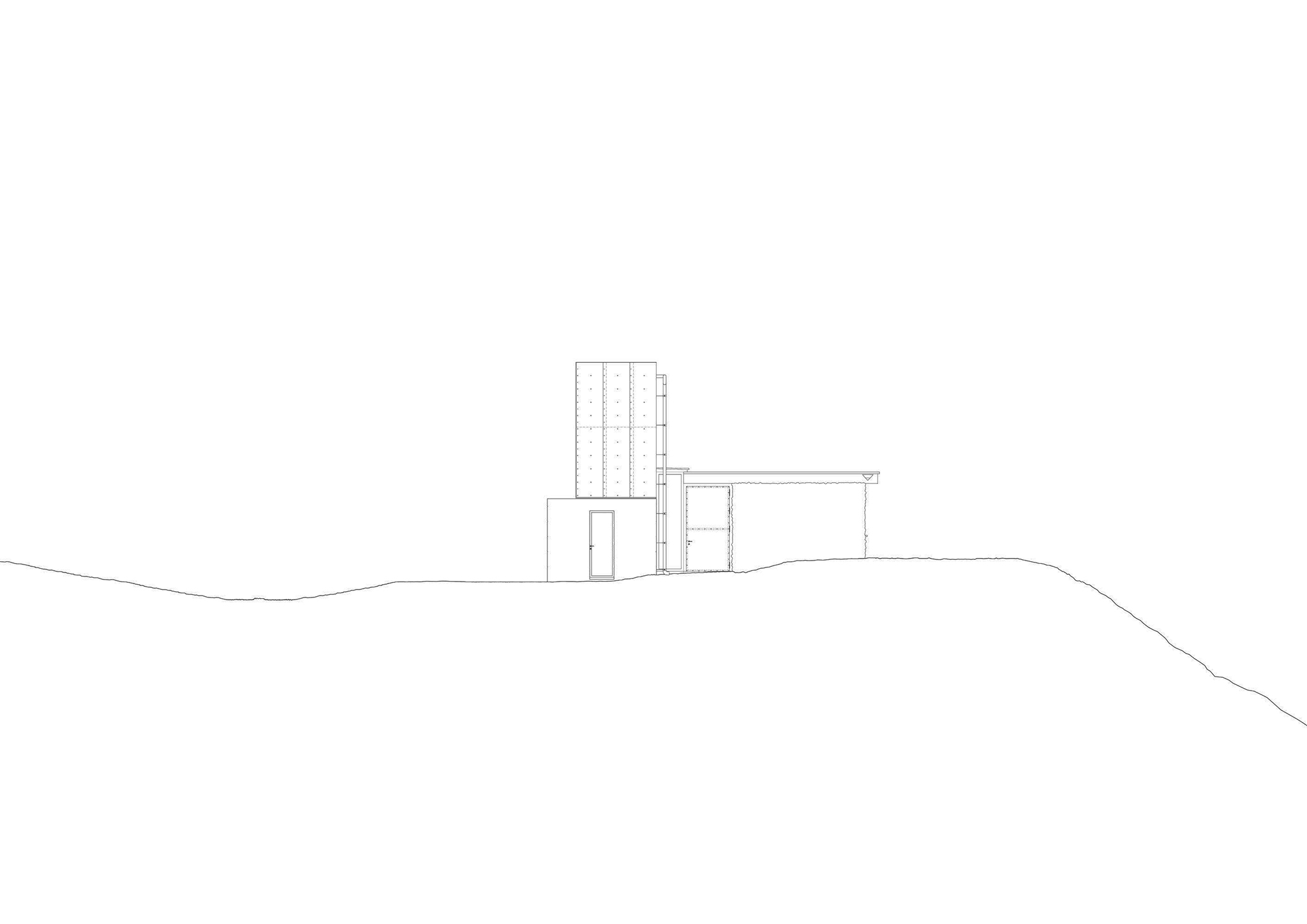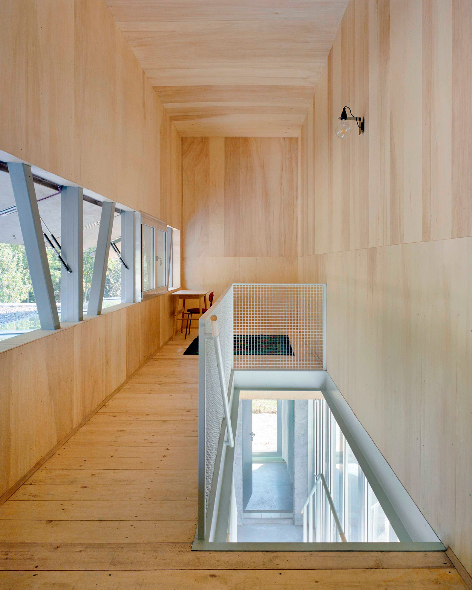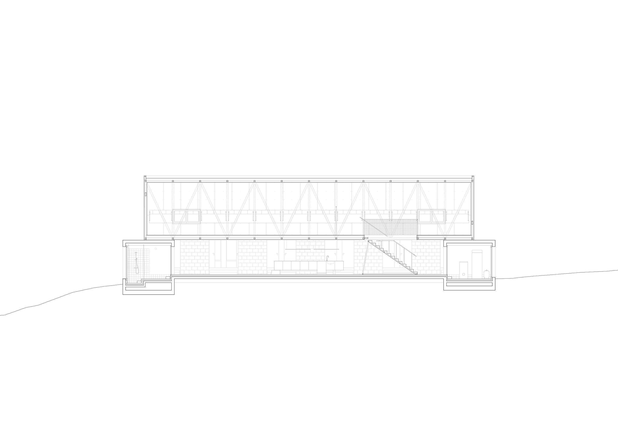 Sobre el área común se encuentra una sala multifuncional de 26 metros de largo, inspirada en la tipología tradicional de almacenamiento pastoral. Construida como una estructura de celosía y revestida con paneles metálicos en el exterior y madera en el interior, esta estructura ofrece un espacio prominente y aislado según las necesidades. Esta versátil sala alberga diversas actividades estacionales, desde el almacenamiento de alimentos hasta el alojamiento de residentes adicionales. Se abre únicamente mediante una serie de paneles móviles orientados al norte.