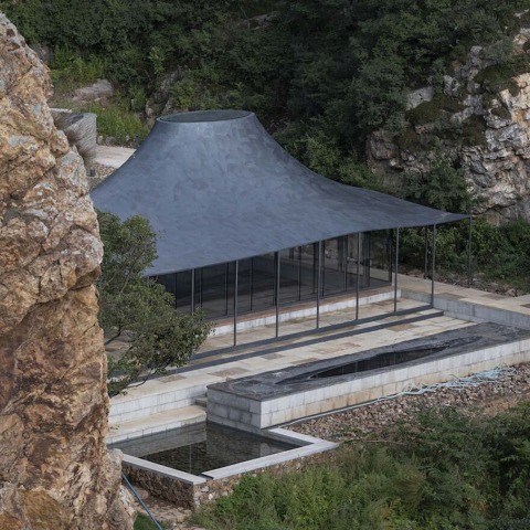 La sala de meditación de estructura de acero y techo de fibra de carbono al pie de la montaña es una reconstrucción pictográfica del carácter chino «舍». El carácter «舍» se compone de tres partes: «亼+屮+口». «亼» es el techo, «屮» es la viga y la columna, y «口» es la base. Dos anillos de esbeltas columnas de acero por dentro y por fuera sostienen el techo curvo. La altura cambiante de la base cuadrada se adapta al terreno montañoso en términos de escala, y las columnas de acero en el anillo exterior se ajustan en longitud en consecuencia. Cuando las personas están en la sala de meditación transparente, el paso de la montaña se convierte en un recinto real, y solo la dirección que da al valle está lo suficientemente abierta. No muy lejos, la Gran Muralla de la dinastía Ming es un fósil del tiempo. Todos los arreglos son para este momento de tranquilidad.