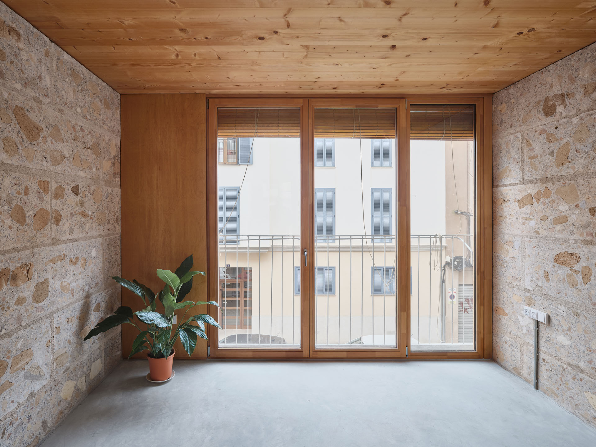 Los bloques de la planta superior, con menor carga, están hechos de hormigón 100% de cal, mientras que el resto de las plantas combinan cal con cemento. Estos bloques, de aproximadamente 135 cm de largo, 42 cm de alto y con anchos variables para cada planta (64, 54, 44 y 34 cm), se prefabricaron una vez finalizada la demolición, antes de comenzar la construcción del nuevo edificio. Este enfoque redujo significativamente la duración de la obra. Los bloques se apilaron para construir muros de carga perpendiculares a la calle, que soportan techos de madera contralaminada. En cada planta, el espesor de los muros se reduce en 10 cm, lo que permite el apoyo directo de los paneles de madera y agiliza la ejecución de toda la estructura.
