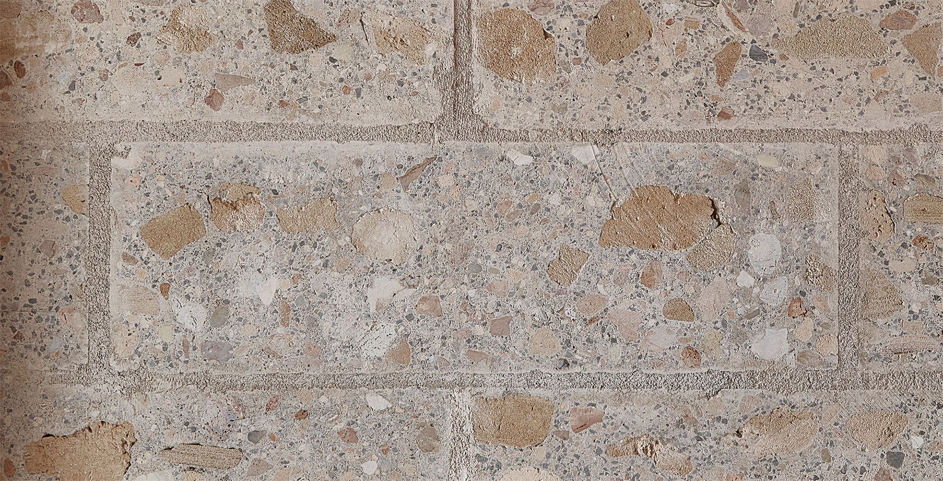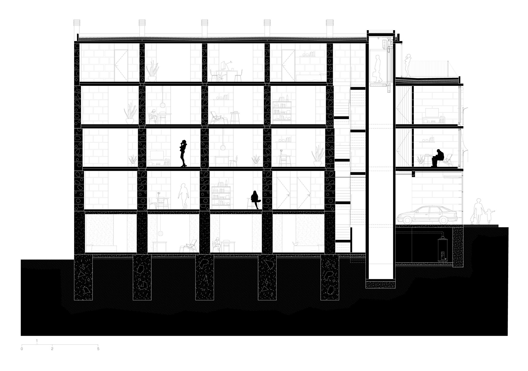 Perpendicularmente a los muros principales, tabiques de 13 cm de espesor, construidos con el mismo hormigón ciclópeo y resultantes del corte de un bloque de 60 cm de ancho en cuatro secciones de 13 cm, unen la estructura de todo el edificio, junto con el núcleo de escaleras y ascensores.