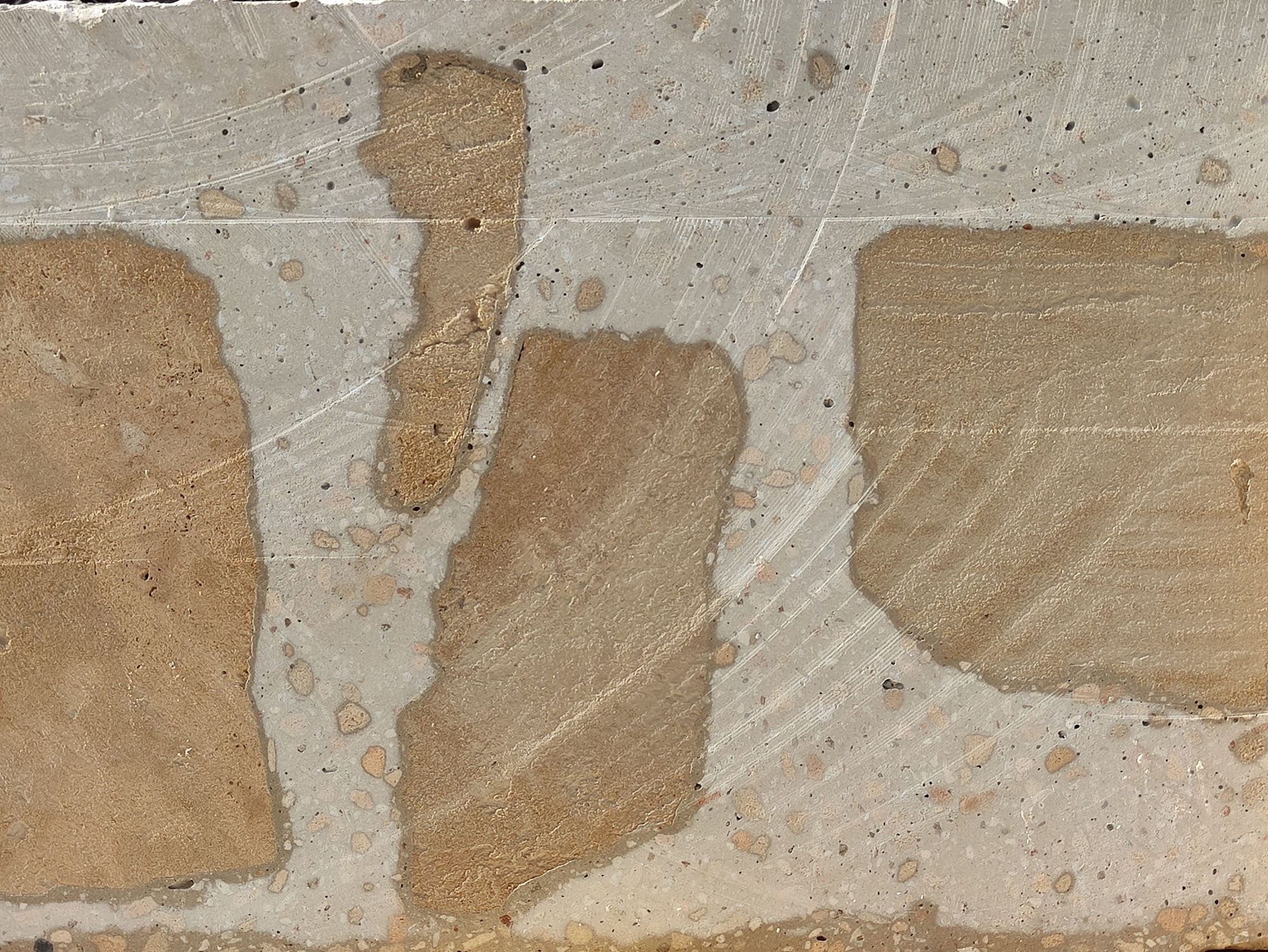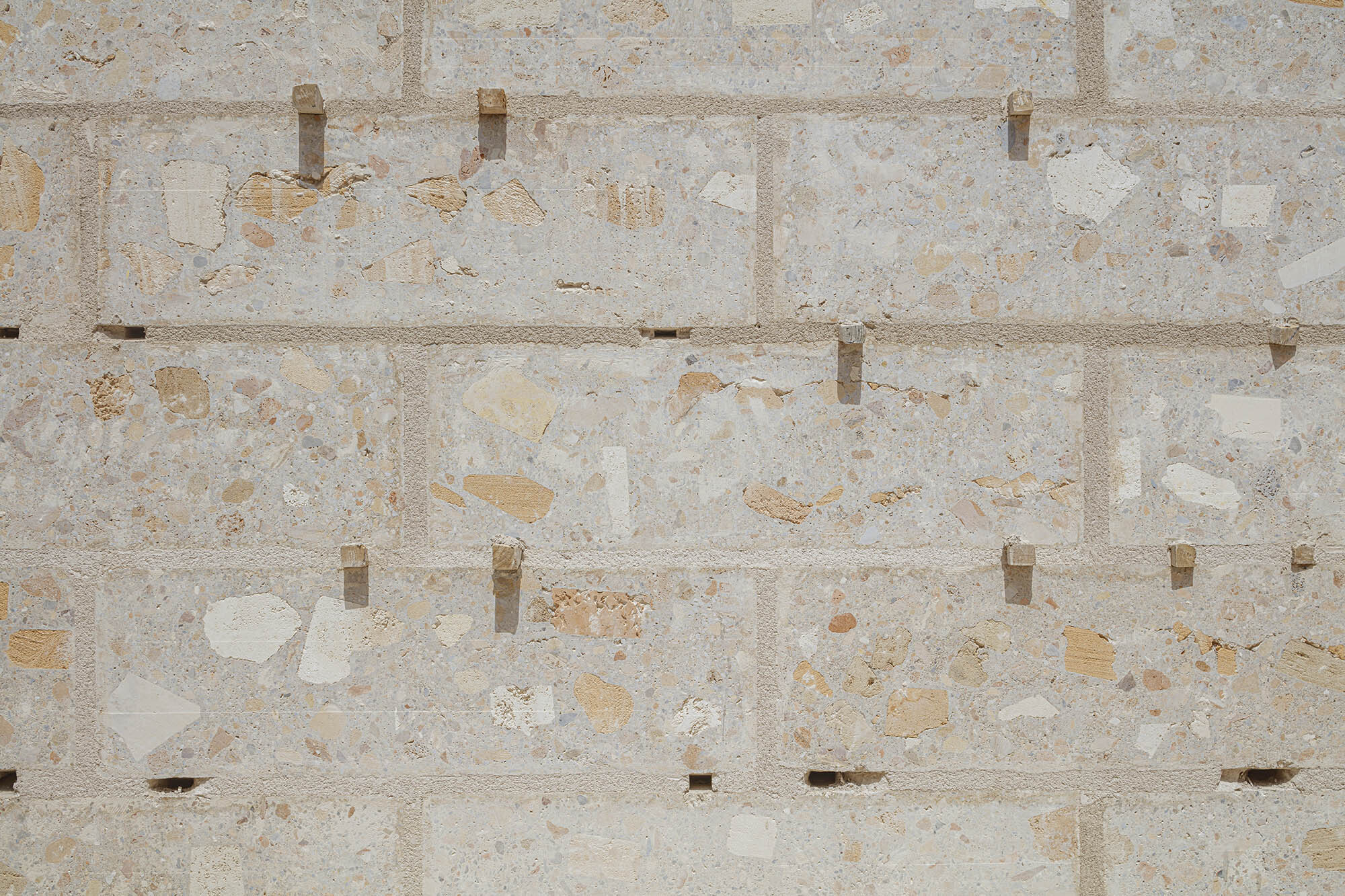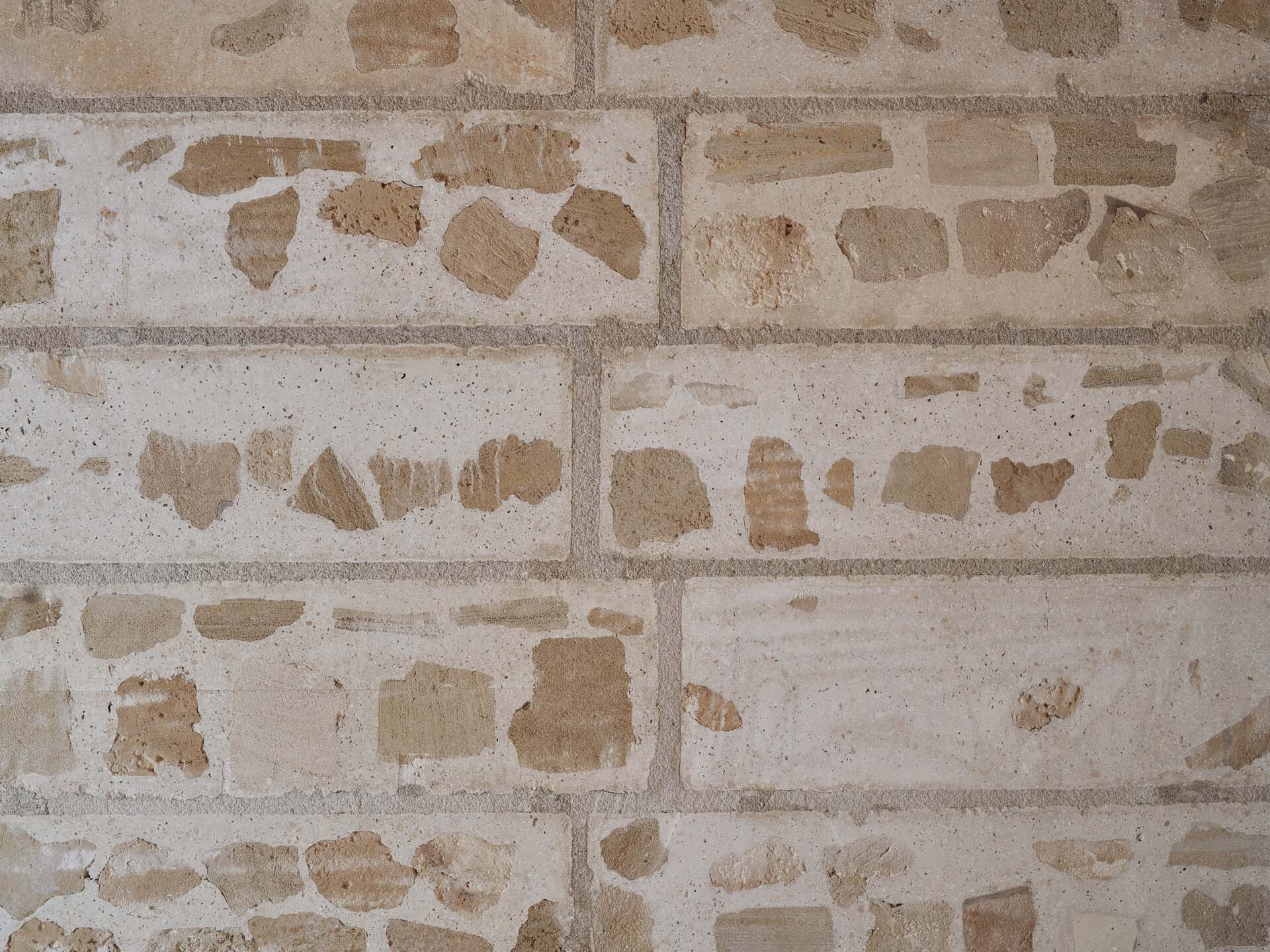 Una vez finalizada la demolición y seleccionados los materiales, casi todos los escombros se reutilizaron según su tipo. En primer lugar, se vertieron piezas de cerámica y hormigón (140 m³) en los fosos de cimentación y los muros del semisótano. En segundo lugar, toda la arenisca (unos 160 m³) se utilizó para construir grandes bloques (aproximadamente 3.000 unidades) de hormigón ciclópeo con cemento y cal mezclados con piedra de marès reciclada (40% del volumen del bloque), compuestos por grandes cantos rodados de hasta 30 cm de diámetro, grava de arenisca y picadís (arena, también de marès). Cada bloque se cortó con una sierra de disco grande a partir de una losa de 4 x 4 m, de modo que las piedras reaparecieran en las caras de los bloques.