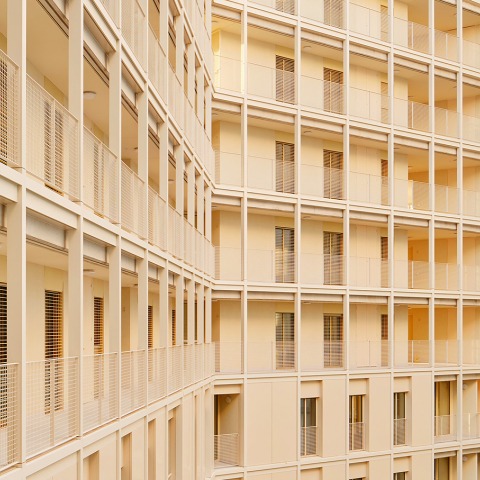 Para el desarrollo del conjunto de viviendas colectivas, Vivas Arquitectos y Pau Vidal proponen una serie de tipologías de viviendas flexibles de doble orientación, que se acceden mediante pasarelas exteriores. En sintonía con estrategias pasivas de acondicionamiento, la doble orientación mejora la ventilación cruzada y el aprovechamiento de la luz del sol.