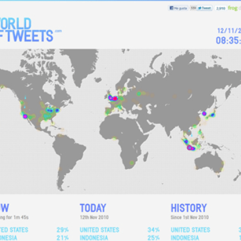 El mundo de Tweets nos muestra un mapeado de calor visualizando en qué lugar la gente está conectada con Twitter en tiempo real. Tweets muestran qué región específica es la "más caliente", es decir, se vuelve más roja. Esta permanente muestra de los estados de Twitter nos indica la increíble relación del mundo que vivimos con la virtualidad de la red social Twitter. Échale también un vistazo a la vista en 3D.