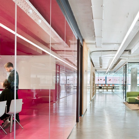 El uso de colores vibrantes es una manera de identificar y diferenciar los espacios funcionales, como meeting room o phone booth, contrastando con el blanco y la madera predominantes en el proyecto.