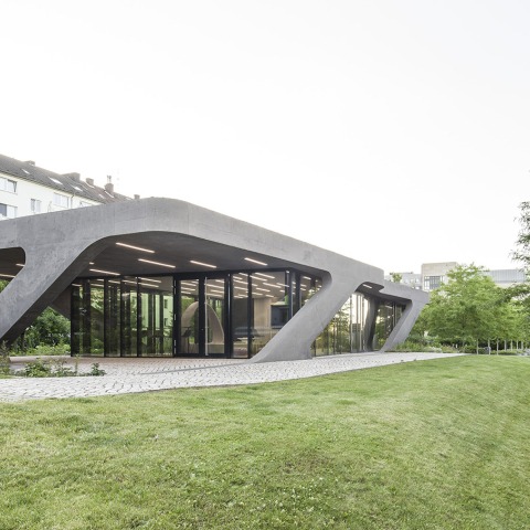 El campus de 8.000 metros cuadrados de FOM Hochschulzentrum está ubicado en Quartier Central, un barrio urbano vital ubicado en los terrenos de la antigua estación de tren de carga en Duesseldorf Dehrendorf. Cinco años después de que se completara el nuevo edificio de la universidad, este pabellón es un anexo conectado al edificio principal y ofrece un nuevo espacio social de unos 100 metros cuadrados con terrazas exteriores con sombra debajo de su techo flotante en voladizo. Se acurruca en los brazos exteriores del Stadtpark y cierra la zona ajardinada atravesada por el renovado río Duessel.