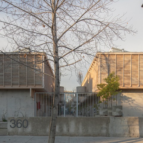 Hacia los deslindes, estos enmarcan las ventanas de los dormitorios, impidiendo la vista al patio vecino. Hacia el pasaje, en cambio, enmarcan una serie de paramentos tinglados con tejas de alerce, generando un muro. La repetición de este módulo cualifica las fachadas con un ritmo constante que difumina la presencia singular de cada casa en dos volúmenes unitarios sobre el pasaje central. Entre ellos, una serie de maceteros con árboles en volado destacan las entradas a las casas y esconden la presencia de los grandes edificios sobre el cielo.