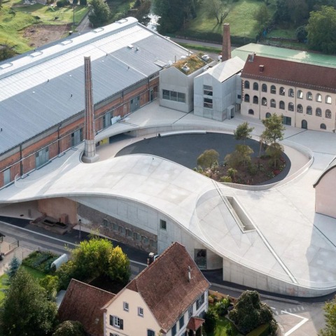 Una superficie ondulada de hormigón armado alude a la producción de vidrio, ya que une los edificios. La superficie funciona como cubierta, techo y pared, conectando las plantas bajas de los edificios para enmarcar una plaza pública. Las nuevas funciones se introducen con sensibilidad debajo y sobre esta superficie, incluidas oficinas, áreas de taller, una cafetería y un restaurante.