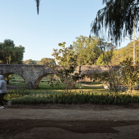 En este espacio confluyen de manera singular el patrimonio edificado del puente, el curso del río que da origen al Valle de Huatzindeo y el predio a cielo abierto que se apropia del paisaje. El propósito fue agregar valor a la ciudad con un proyecto sensible a su ubicación. Un proyecto que fortaleciera la estructura del paisaje existente de huertos y sabinos monumentales en la vereda del rio y que pusiera a disposición esa reserva ecológica para acentuar el carácter patrimonial del puente.