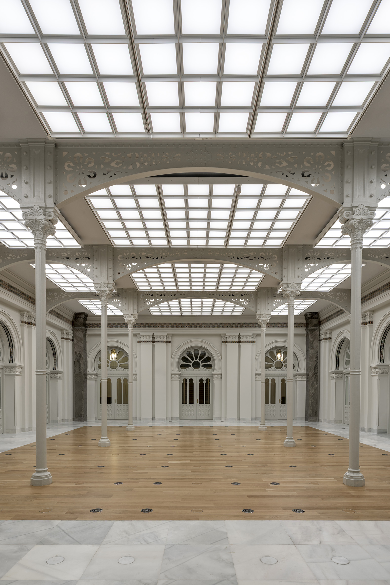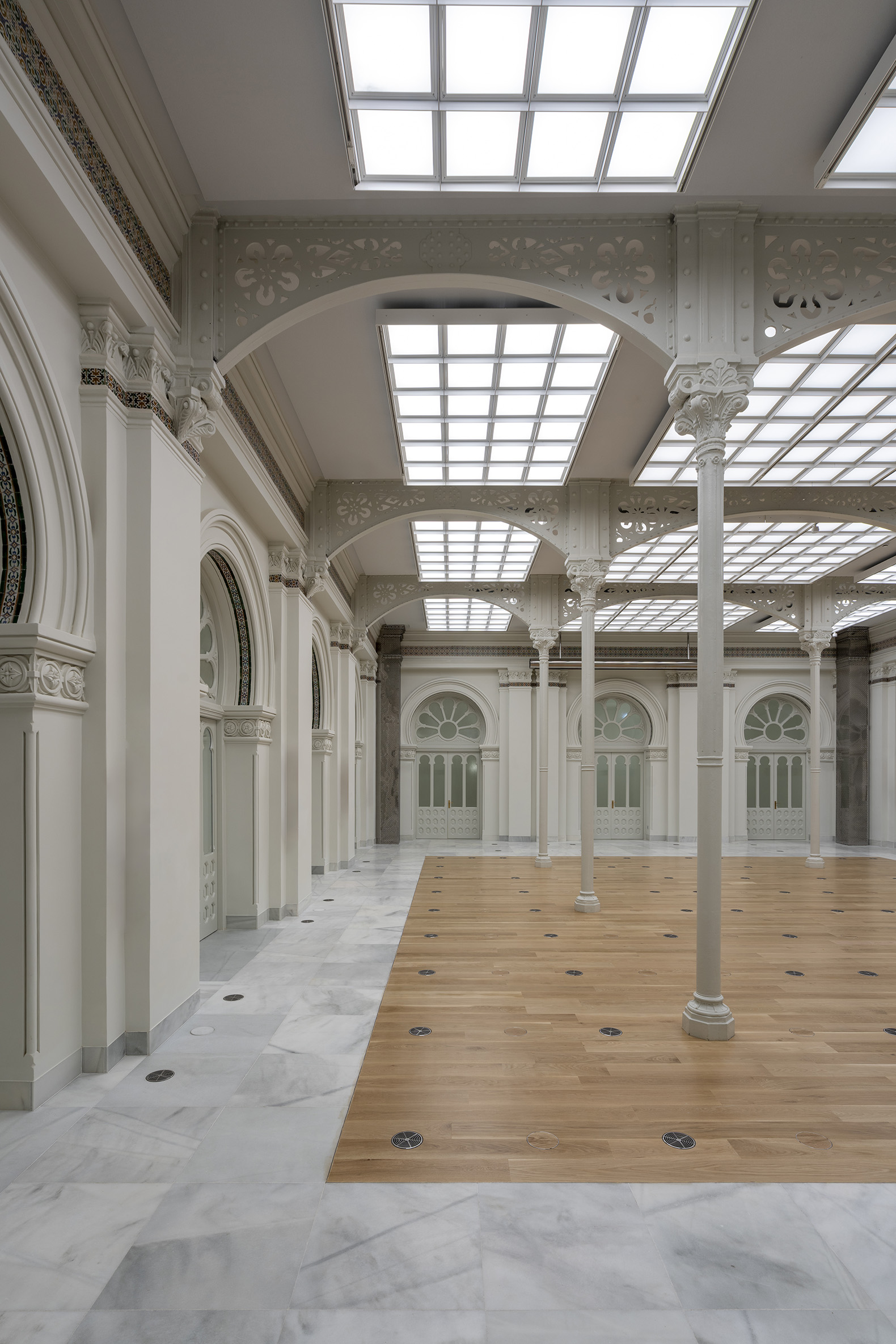 Este espacio, recientemente restaurado por Paredes Pedrosa Arquitectos, se distingue por el alto valor histórico-artístico de su arquitectura de inspiración neoárabe. Los arcos de herradura que componen el patio o el uso de azulejos geométricos en su decoración, son claros ejemplos de inspiración alhambreña implementados por Eduardo de Adaro, el arquitecto responsable del diseño de la sede del siglo XIX.