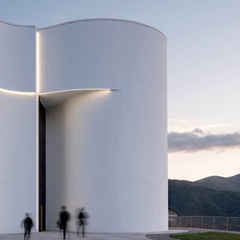 Como una hoja blanca, ligera y continua que se dobla y dibuja una planta orgánica, la arquitectura de la Iglesia con sus 16 metros de altura se erige como un ataúd que preserva y protege la santidad íntima del interior, en diálogo con el paisaje circundante.