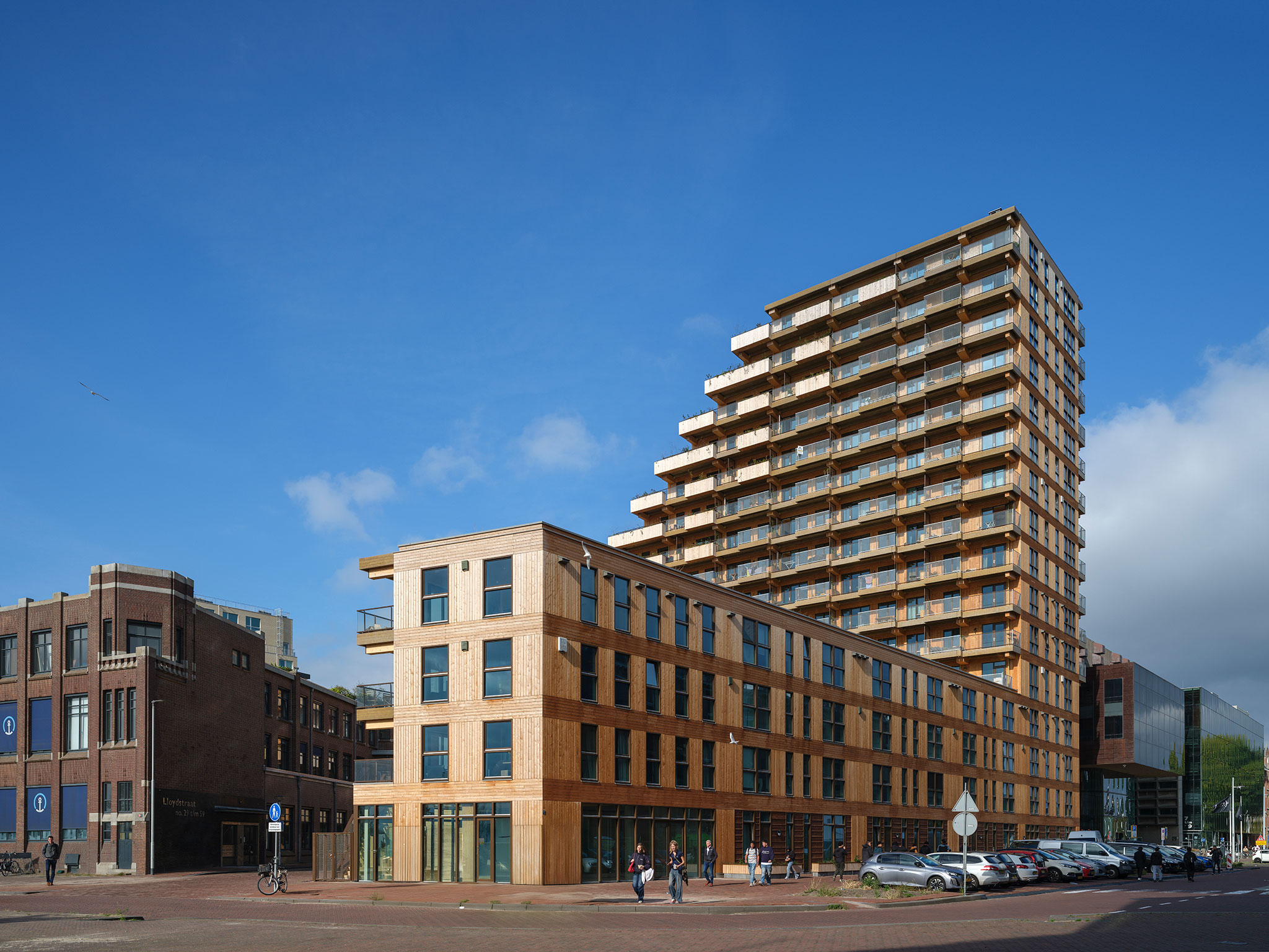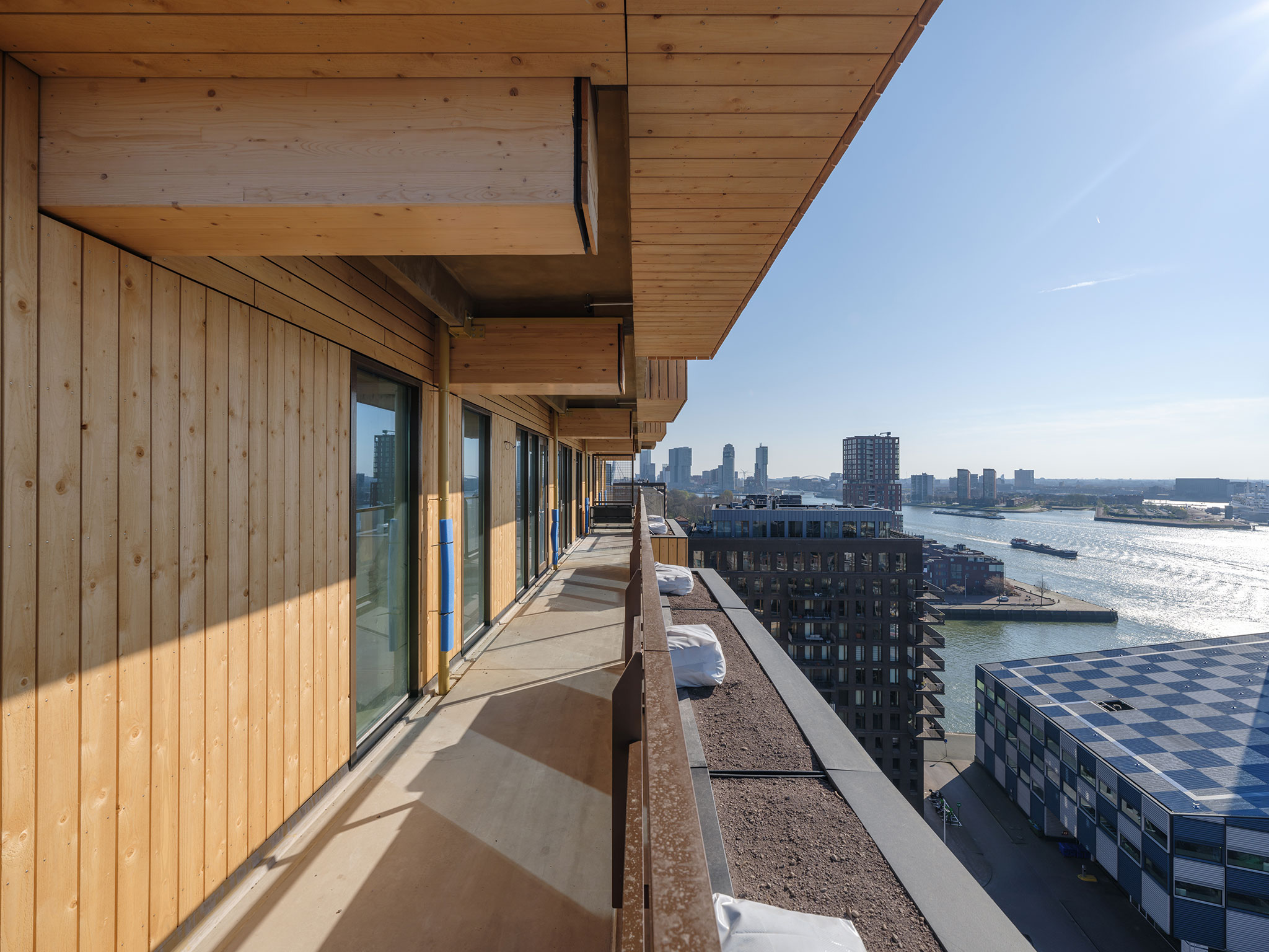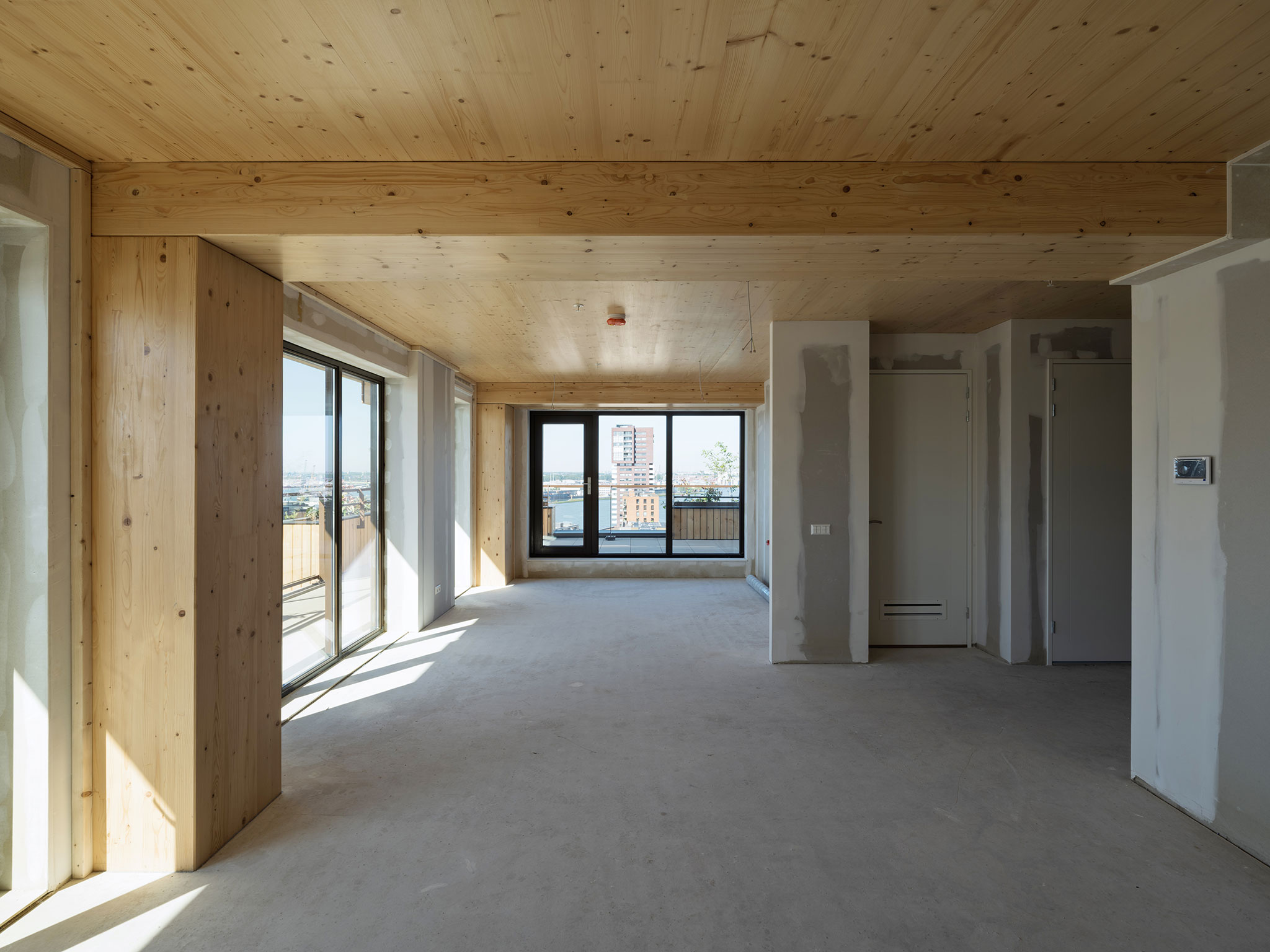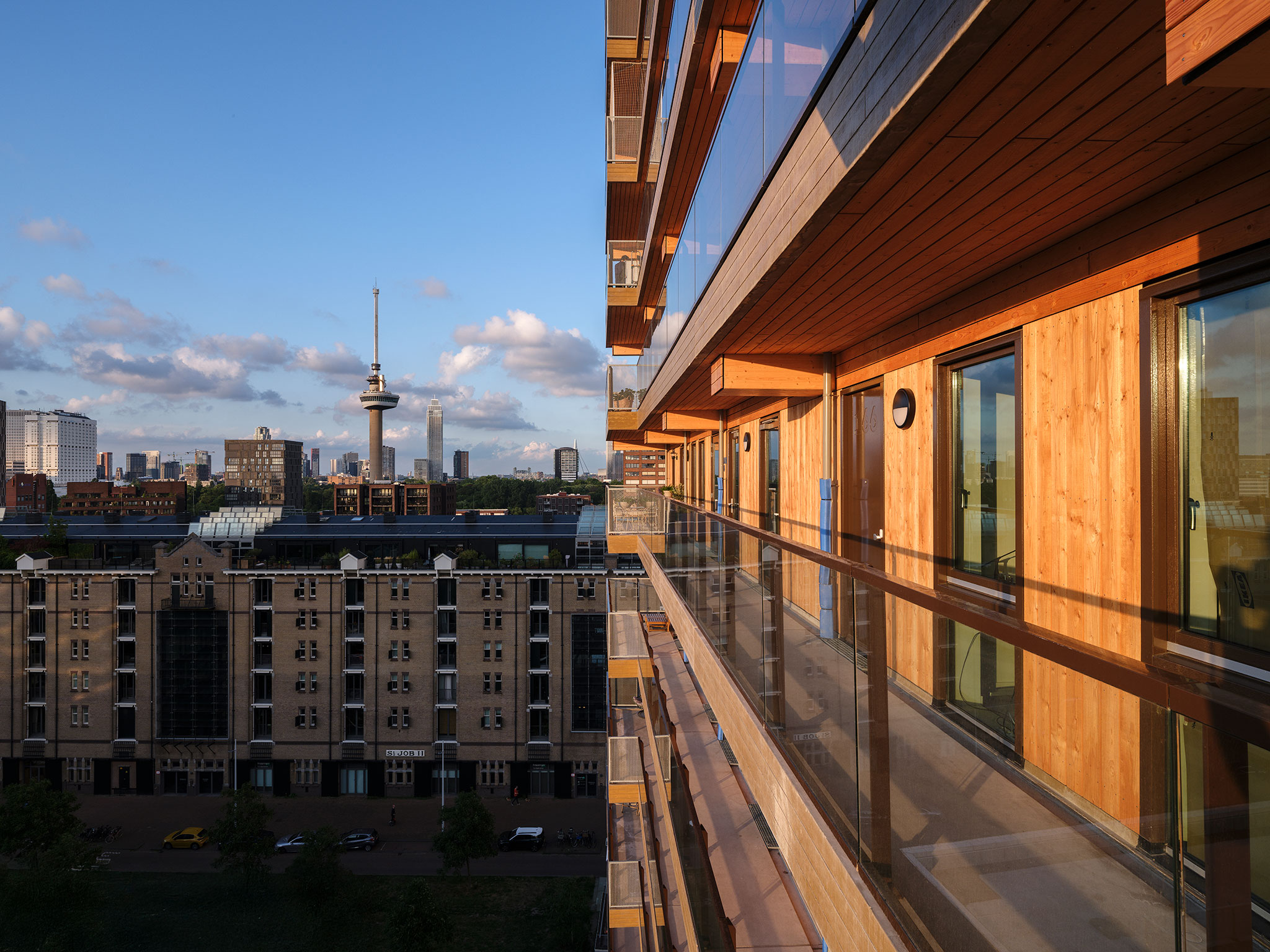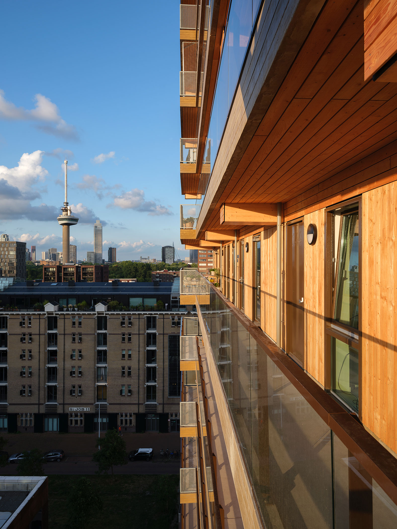 En el contexto de los Acuerdos Climáticos de París y Glasgow, el Pacto Verde Europeo, los Objetivos de Desarrollo Sostenible de la ONU y los objetivos del Ayuntamiento de Róterdam para la reducción de emisiones de CO2, el cliente y el arquitecto comparten la ambición de construir el edificio, incluida la estructura principal, casi en su totalidad en CLT. Construir en CLT ofrece varias ventajas. En primer lugar, la madera almacena CO2, lo que reduce las emisiones. Además, es un excelente material de construcción porque, en comparación con el hormigón, es más ligero, más rápido, más seguro, más duradero y, además, reutilizable. Y, sobre todo, aumenta el confort de la vivienda.