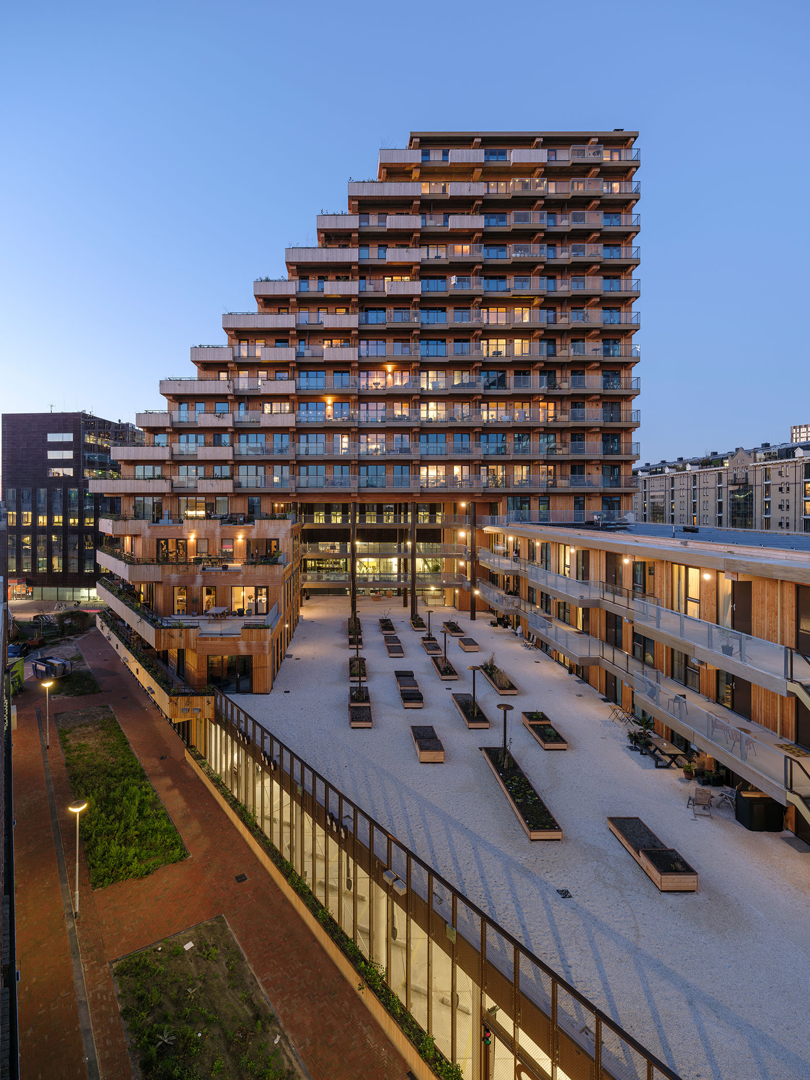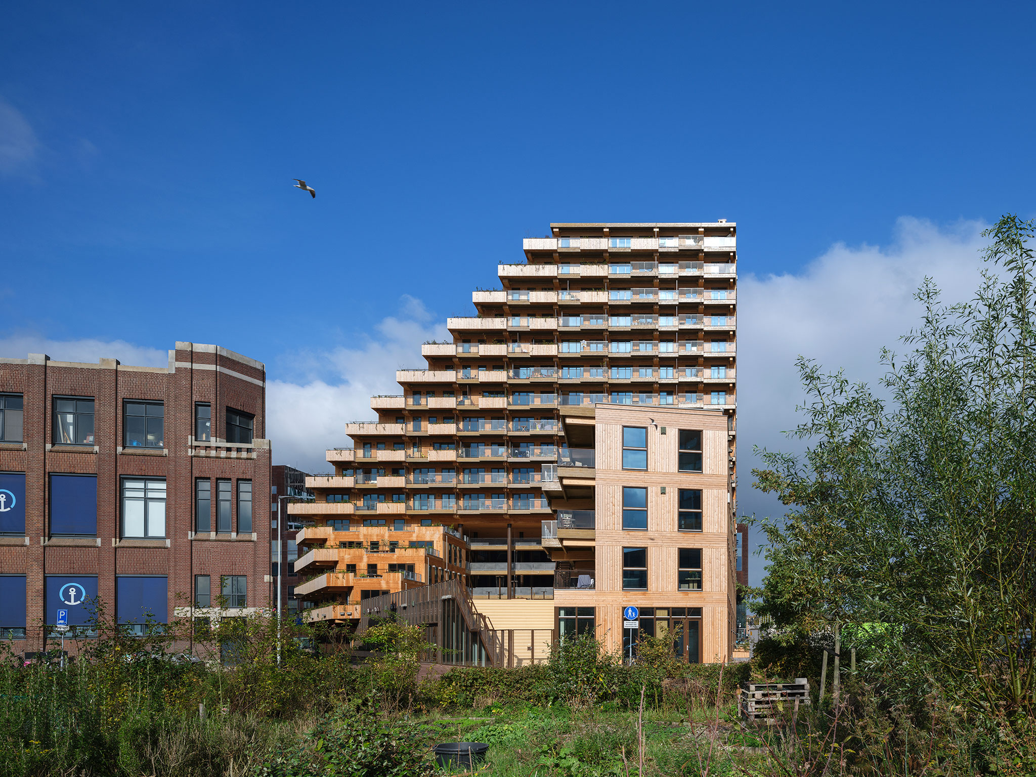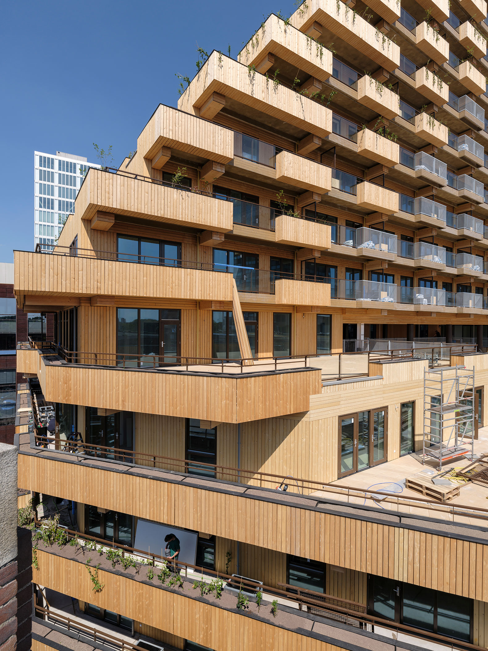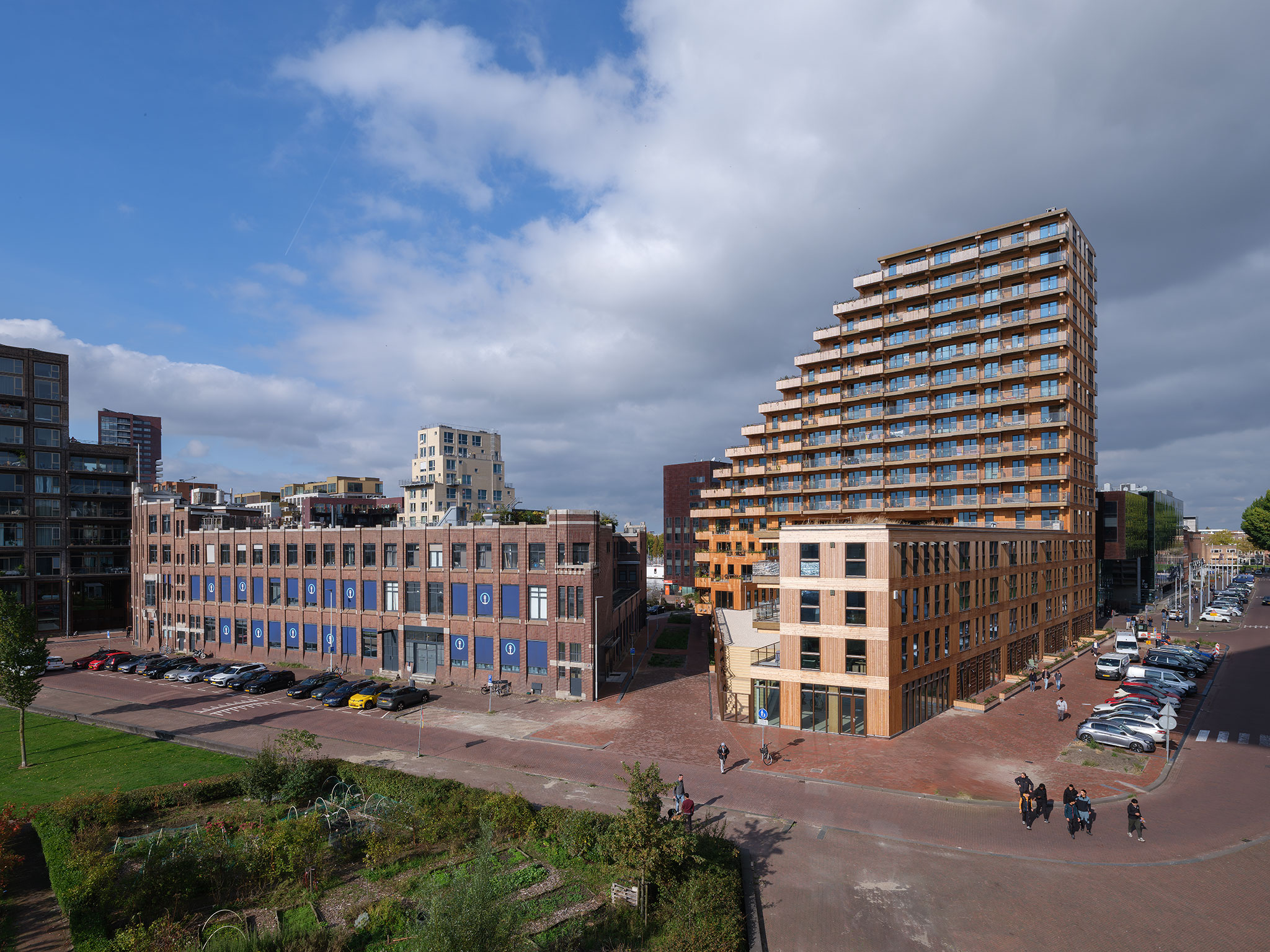 En el contexto de los Acuerdos Climáticos de París y Glasgow, el Pacto Verde Europeo, los Objetivos de Desarrollo Sostenible de la ONU y los objetivos del Ayuntamiento de Róterdam para la reducción de emisiones de CO2, el cliente y el arquitecto comparten la ambición de construir el edificio, incluida la estructura principal, casi en su totalidad en CLT. Construir en CLT ofrece varias ventajas. En primer lugar, la madera almacena CO2, lo que reduce las emisiones. Además, es un excelente material de construcción porque, en comparación con el hormigón, es más ligero, más rápido, más seguro, más duradero y, además, reutilizable. Y, sobre todo, aumenta el confort de la vivienda.