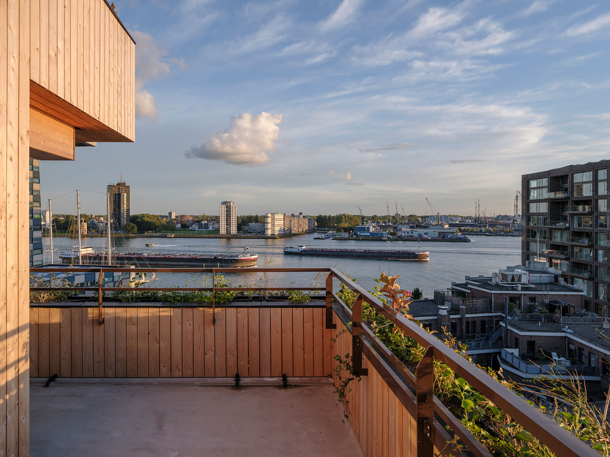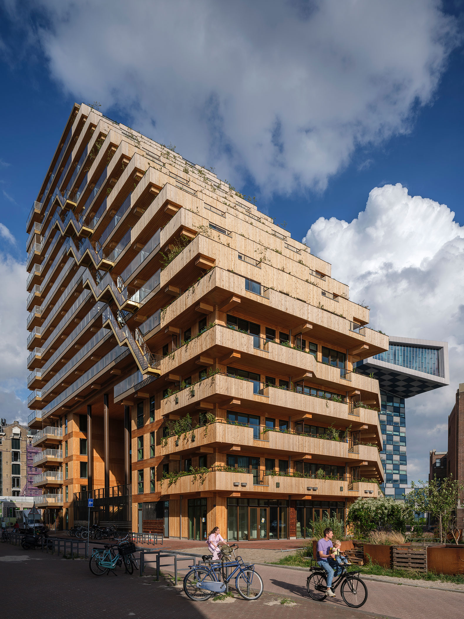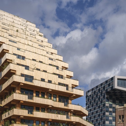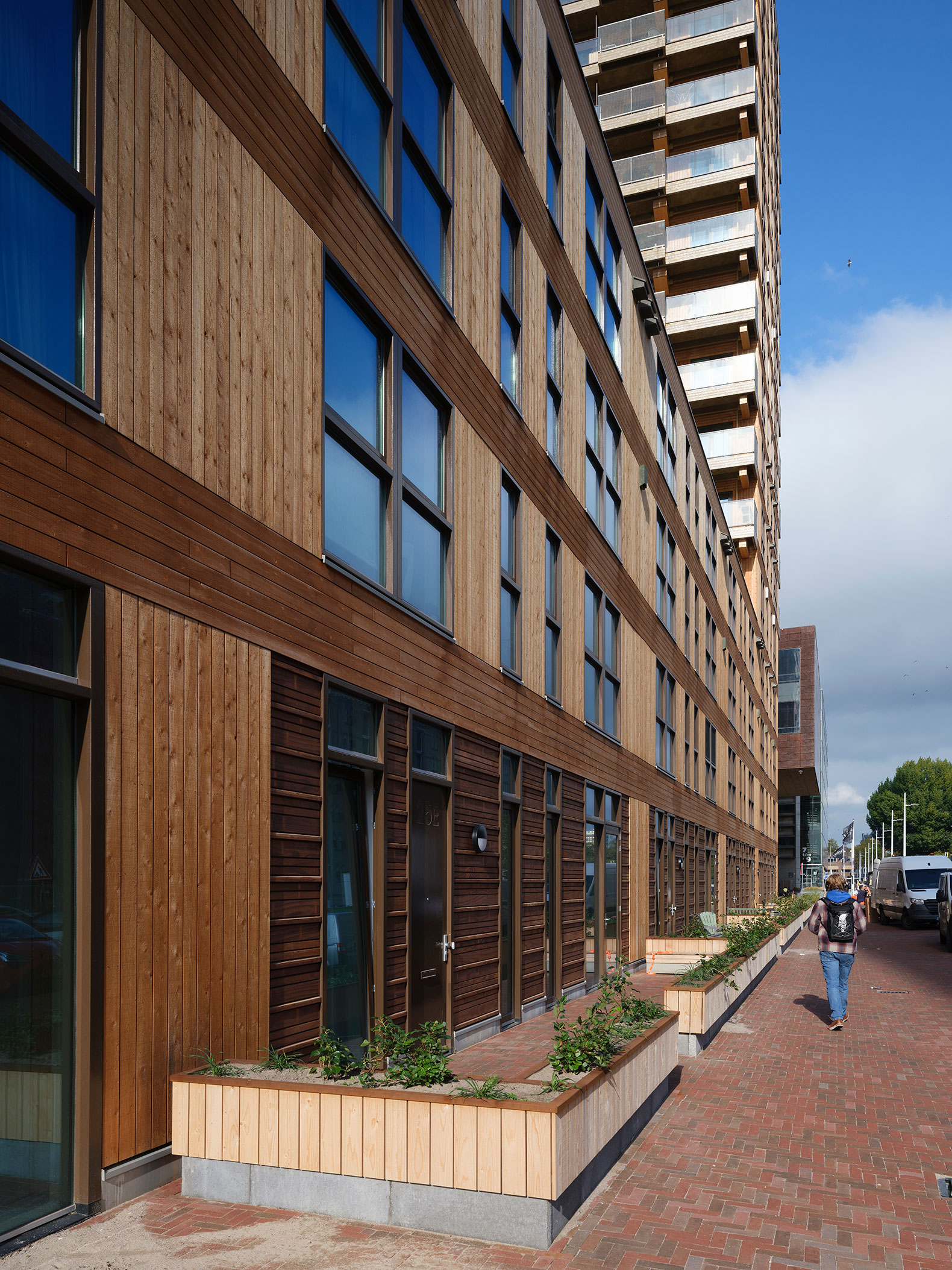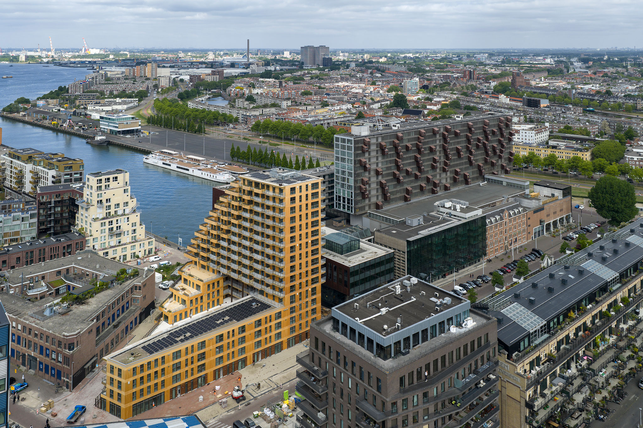 En el contexto de los Acuerdos Climáticos de París y Glasgow, el Pacto Verde Europeo, los Objetivos de Desarrollo Sostenible de la ONU y los objetivos del Ayuntamiento de Róterdam para la reducción de emisiones de CO2, el cliente y el arquitecto comparten la ambición de construir el edificio, incluida la estructura principal, casi en su totalidad en CLT. Construir en CLT ofrece varias ventajas. En primer lugar, la madera almacena CO2, lo que reduce las emisiones. Además, es un excelente material de construcción porque, en comparación con el hormigón, es más ligero, más rápido, más seguro, más duradero y, además, reutilizable. Y, sobre todo, aumenta el confort de la vivienda.