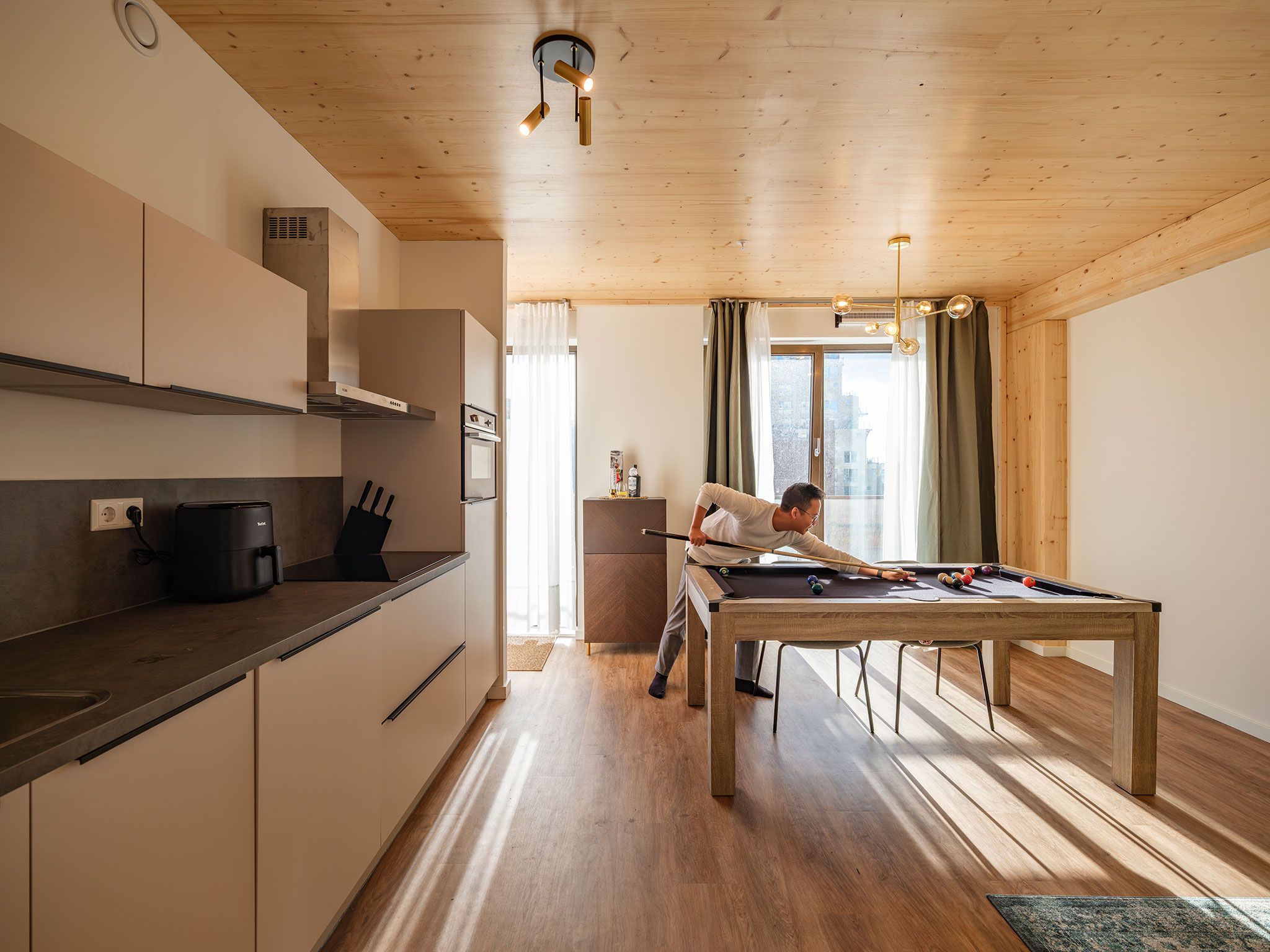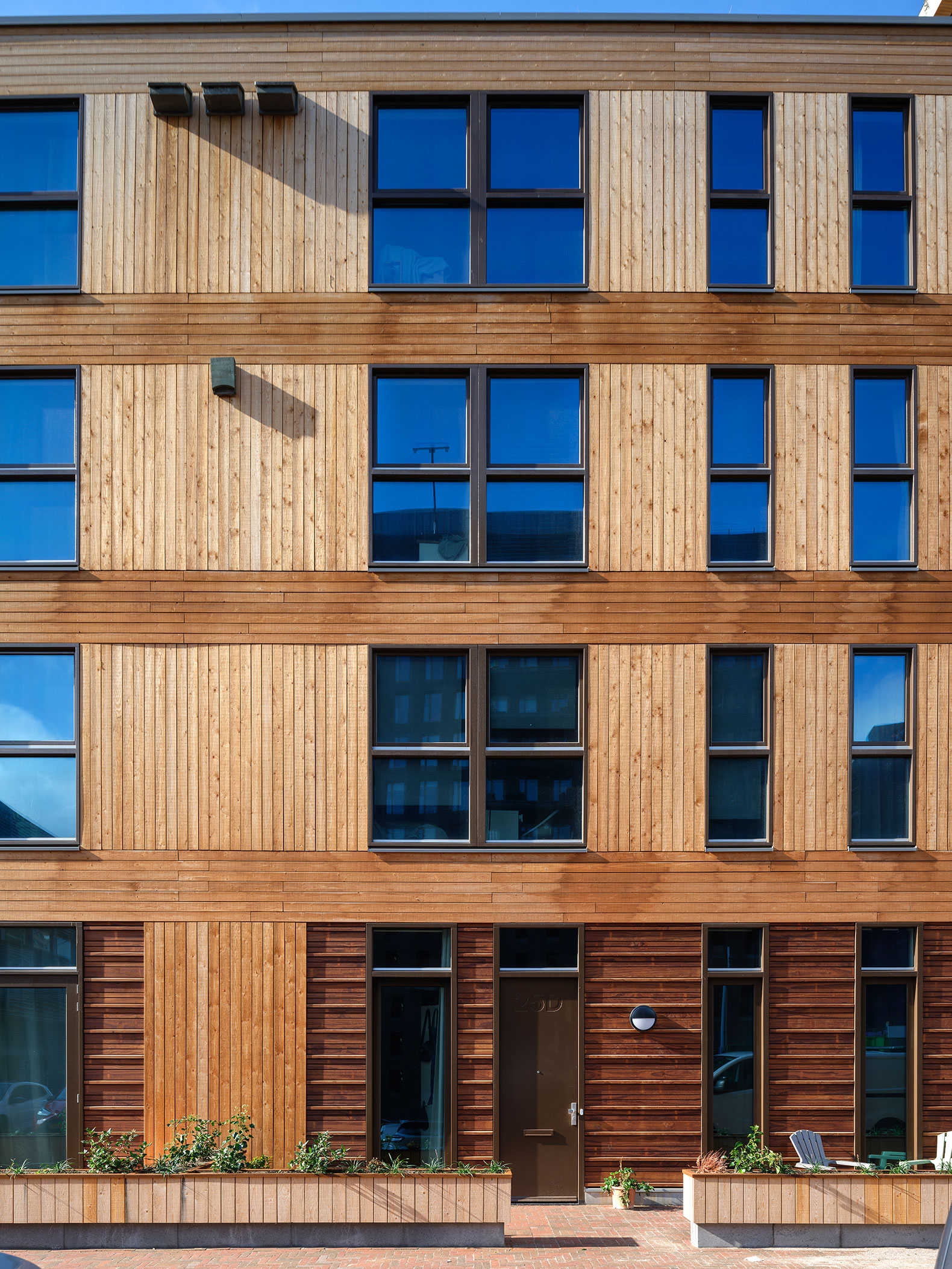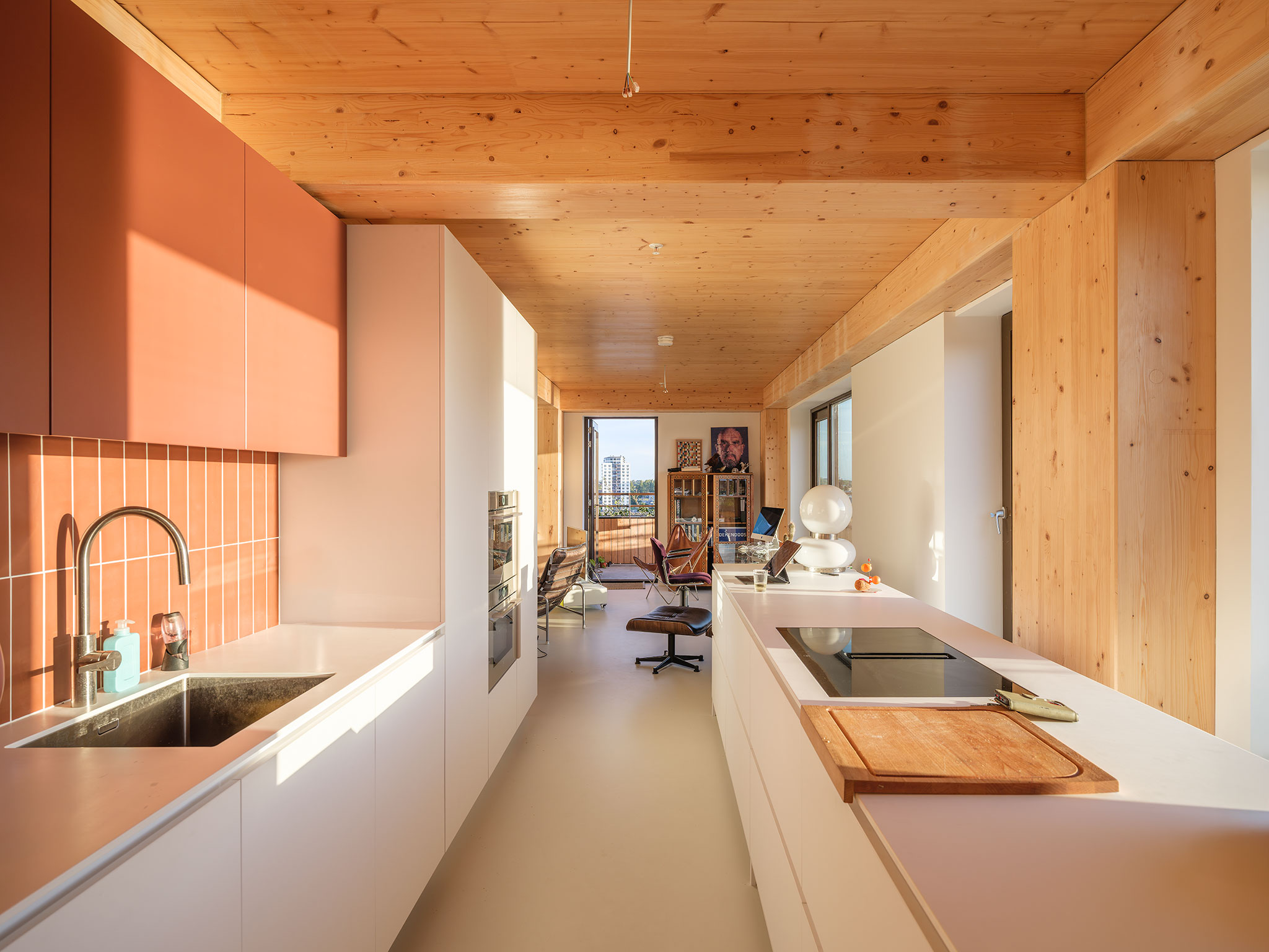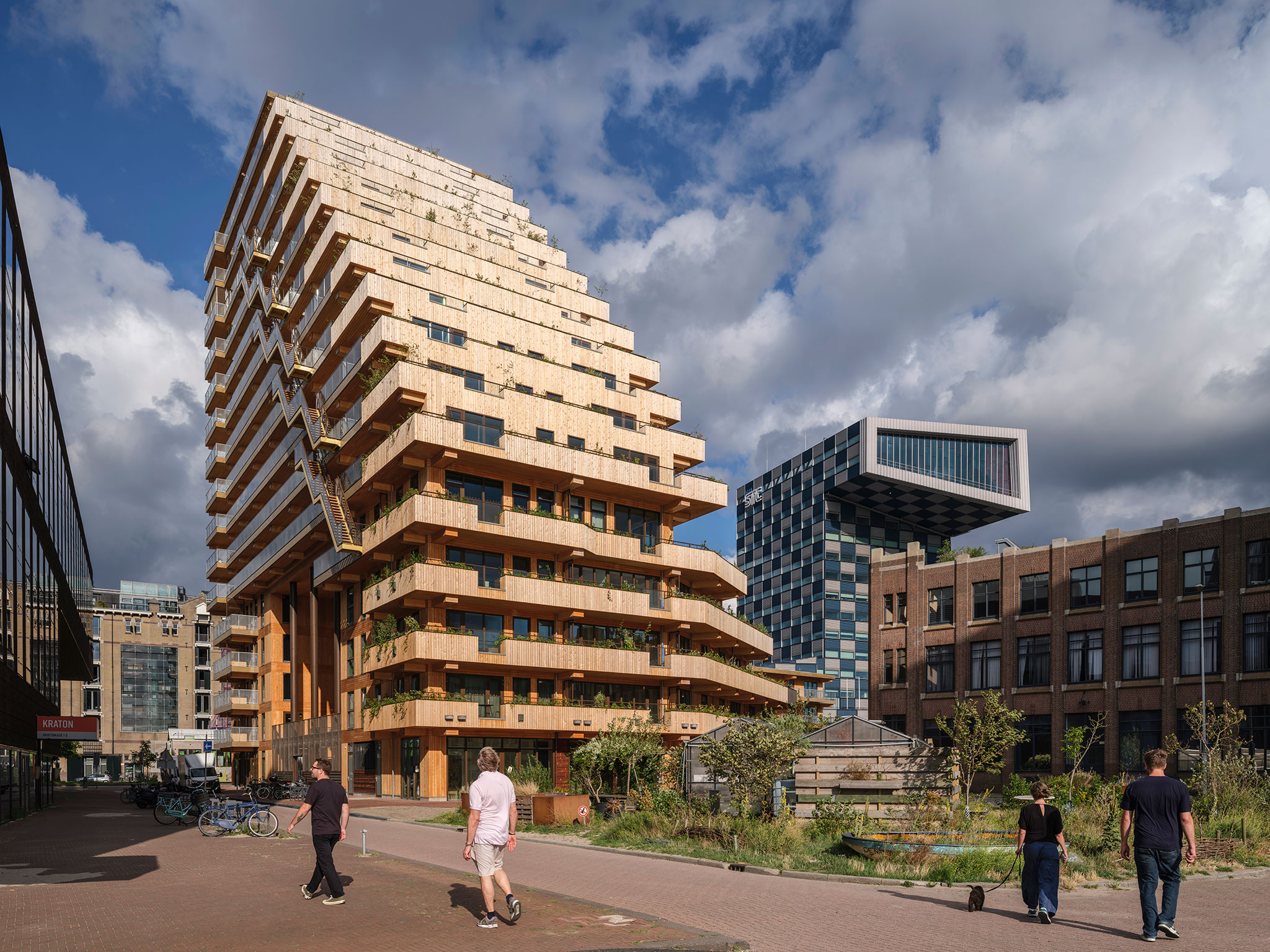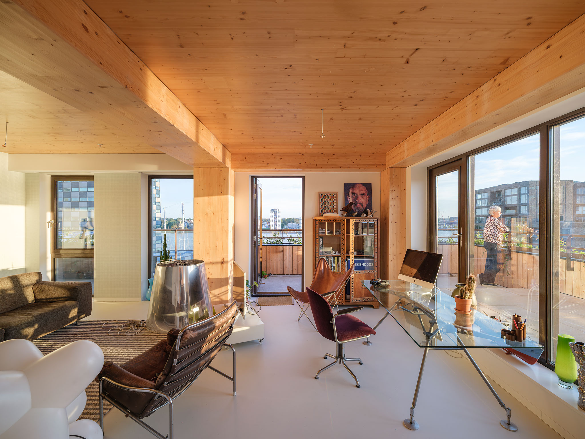 En el contexto de los Acuerdos Climáticos de París y Glasgow, el Pacto Verde Europeo, los Objetivos de Desarrollo Sostenible de la ONU y los objetivos del Ayuntamiento de Róterdam para la reducción de emisiones de CO2, el cliente y el arquitecto comparten la ambición de construir el edificio, incluida la estructura principal, casi en su totalidad en CLT. Construir en CLT ofrece varias ventajas. En primer lugar, la madera almacena CO2, lo que reduce las emisiones. Además, es un excelente material de construcción porque, en comparación con el hormigón, es más ligero, más rápido, más seguro, más duradero y, además, reutilizable. Y, sobre todo, aumenta el confort de la vivienda.