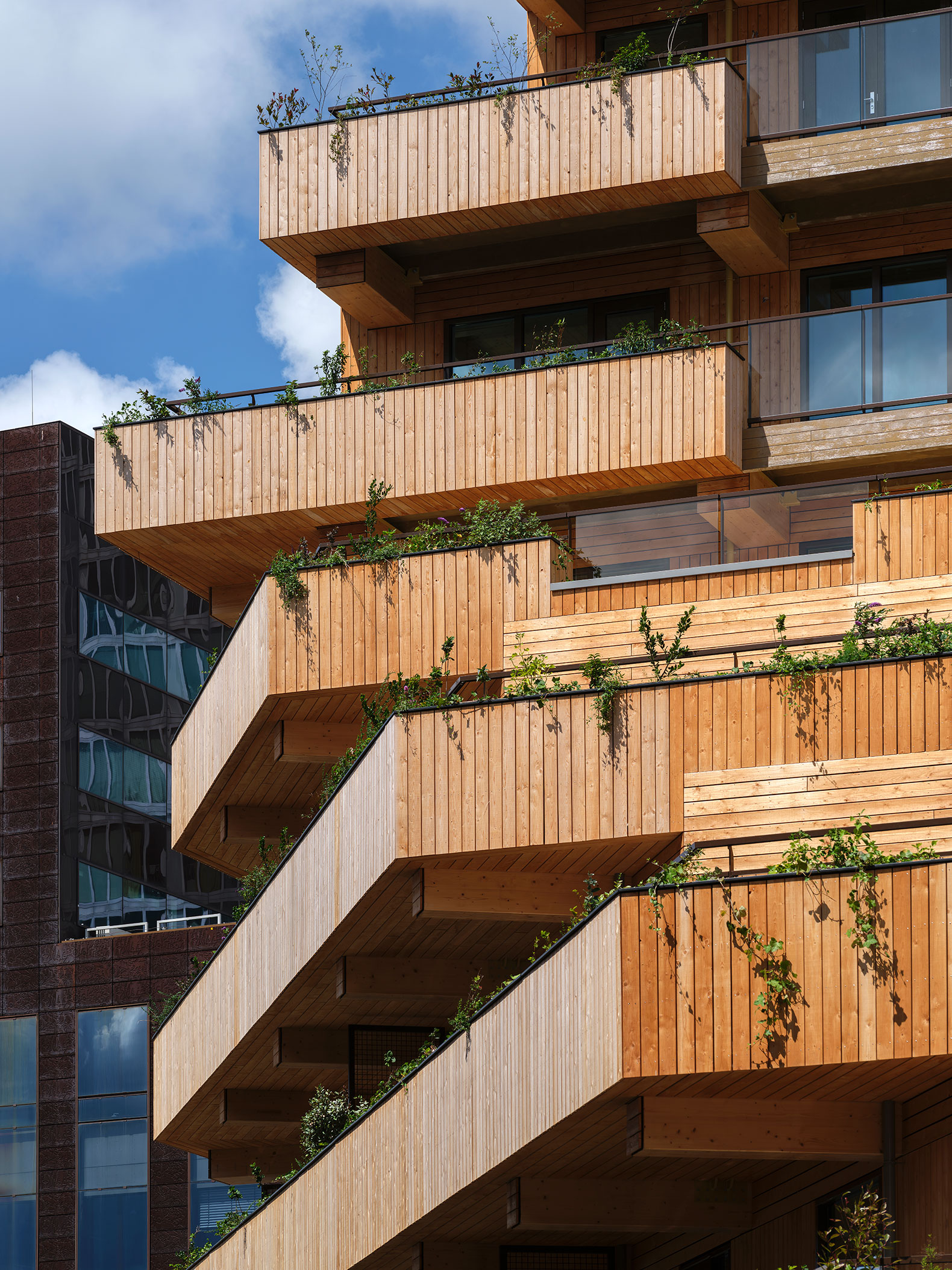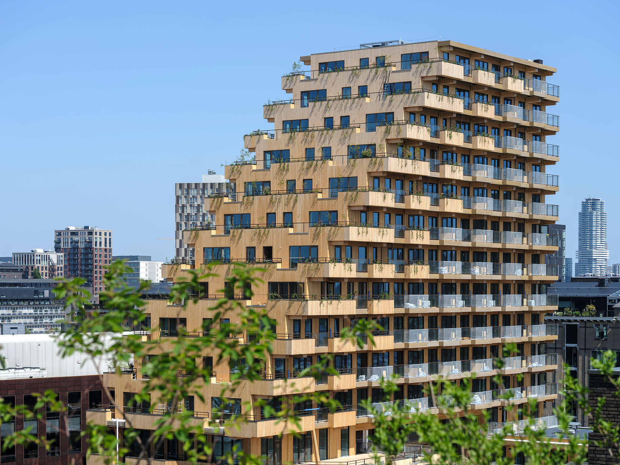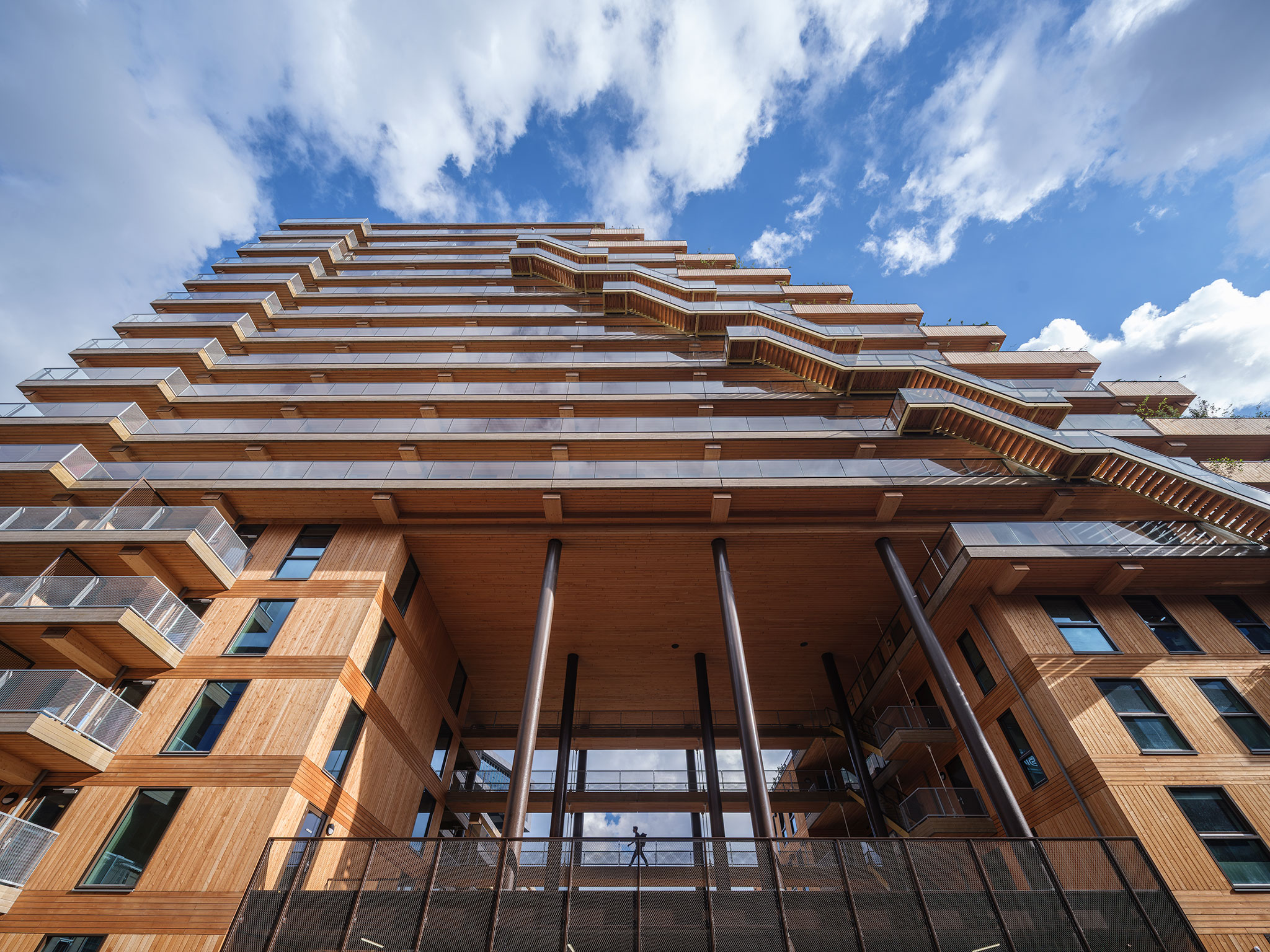 Gracias a la implementación de técnicas constructivas avanzadas y a la estrecha colaboración entre todos los socios, fue posible realizar un edificio íntegramente de madera de 50 metros de altura que propone una nueva forma de construir tanto para las personas como para el clima y la naturaleza.