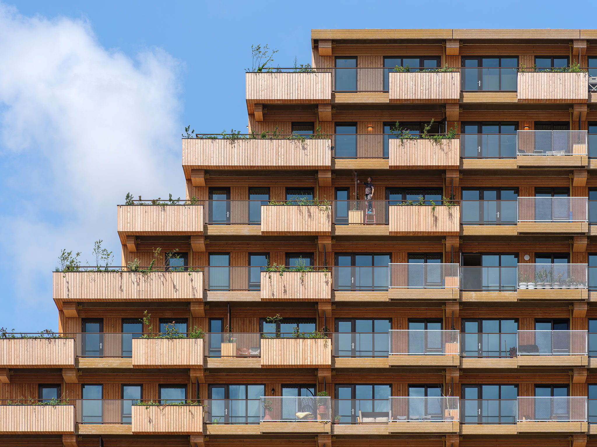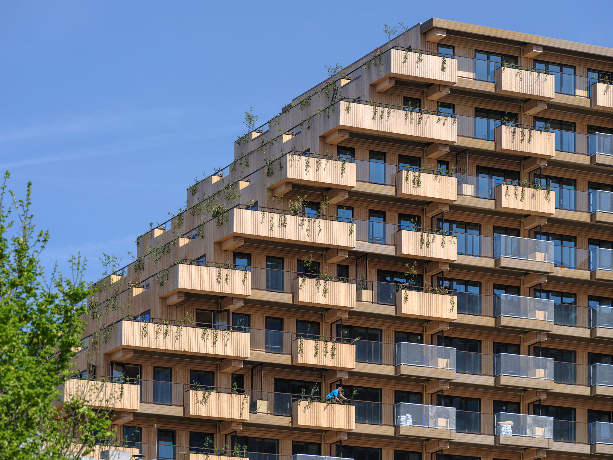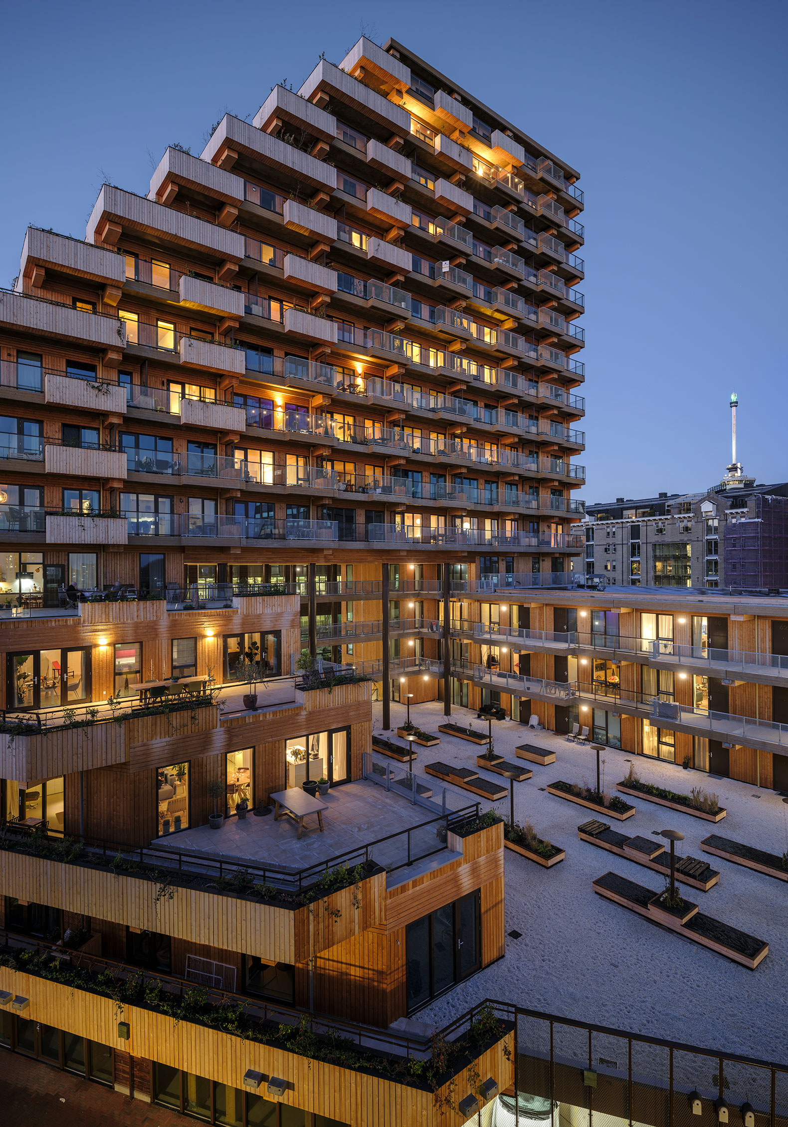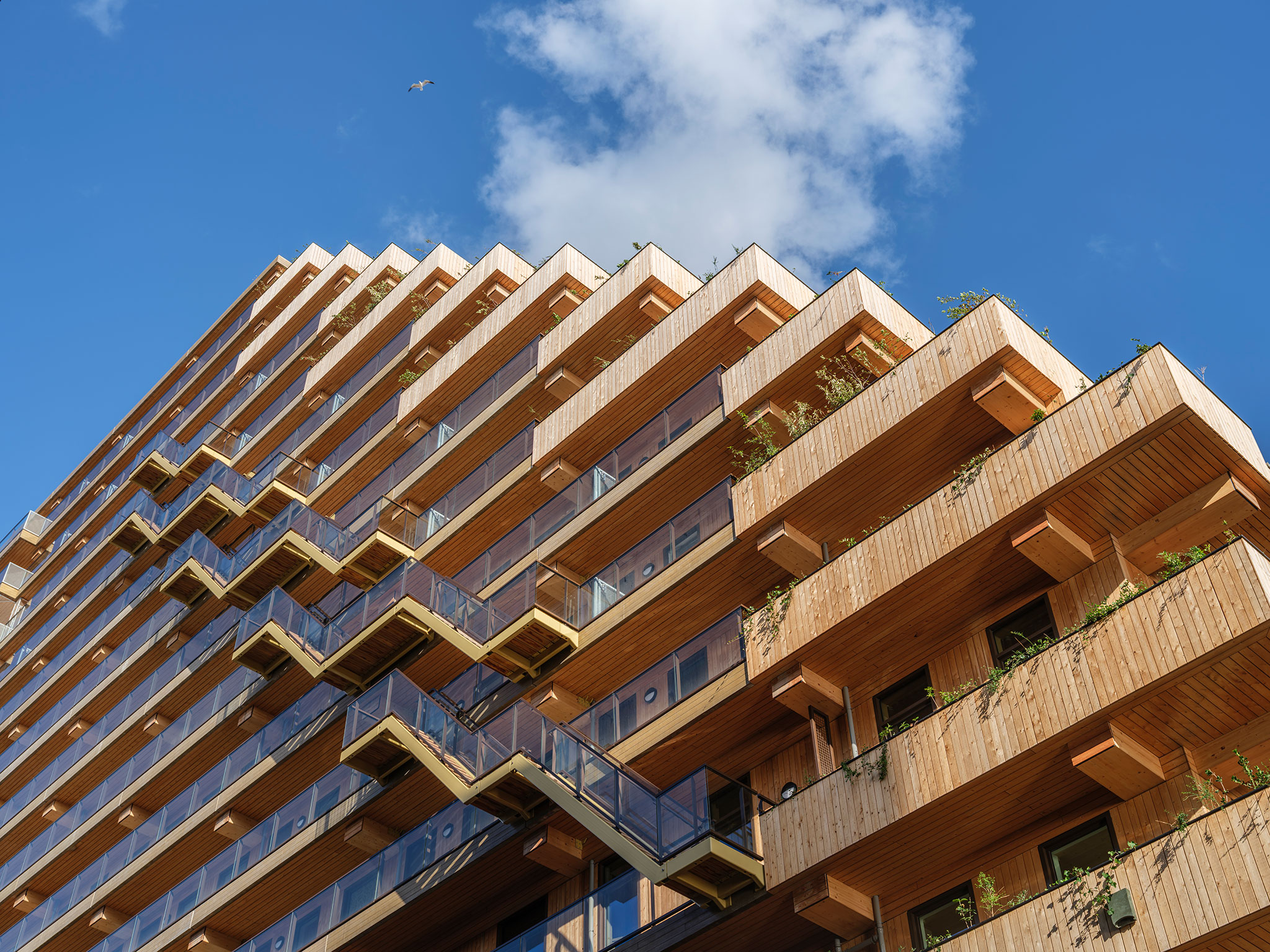 Gracias a la implementación de técnicas constructivas avanzadas y a la estrecha colaboración entre todos los socios, fue posible realizar un edificio íntegramente de madera de 50 metros de altura que propone una nueva forma de construir tanto para las personas como para el clima y la naturaleza.