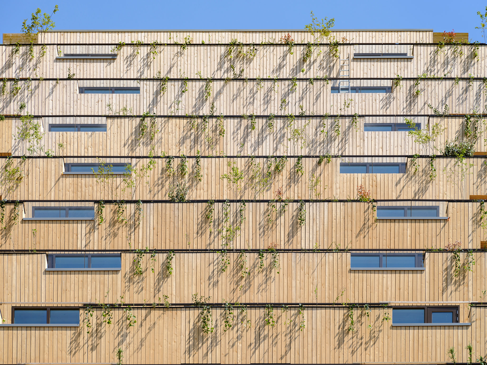 Para la ejecución Mei architects and planners optó por minimizar el uso de hormigón, utilizando principalmente madera de CLT (Cross Laminated Timber, o madera contralaminada). De esta manera, el edificio no solo logró almacenar grandes cantidades de CO₂ a largo plazo, sino que, a la vez, reduce el impacto de su huella de carbono.