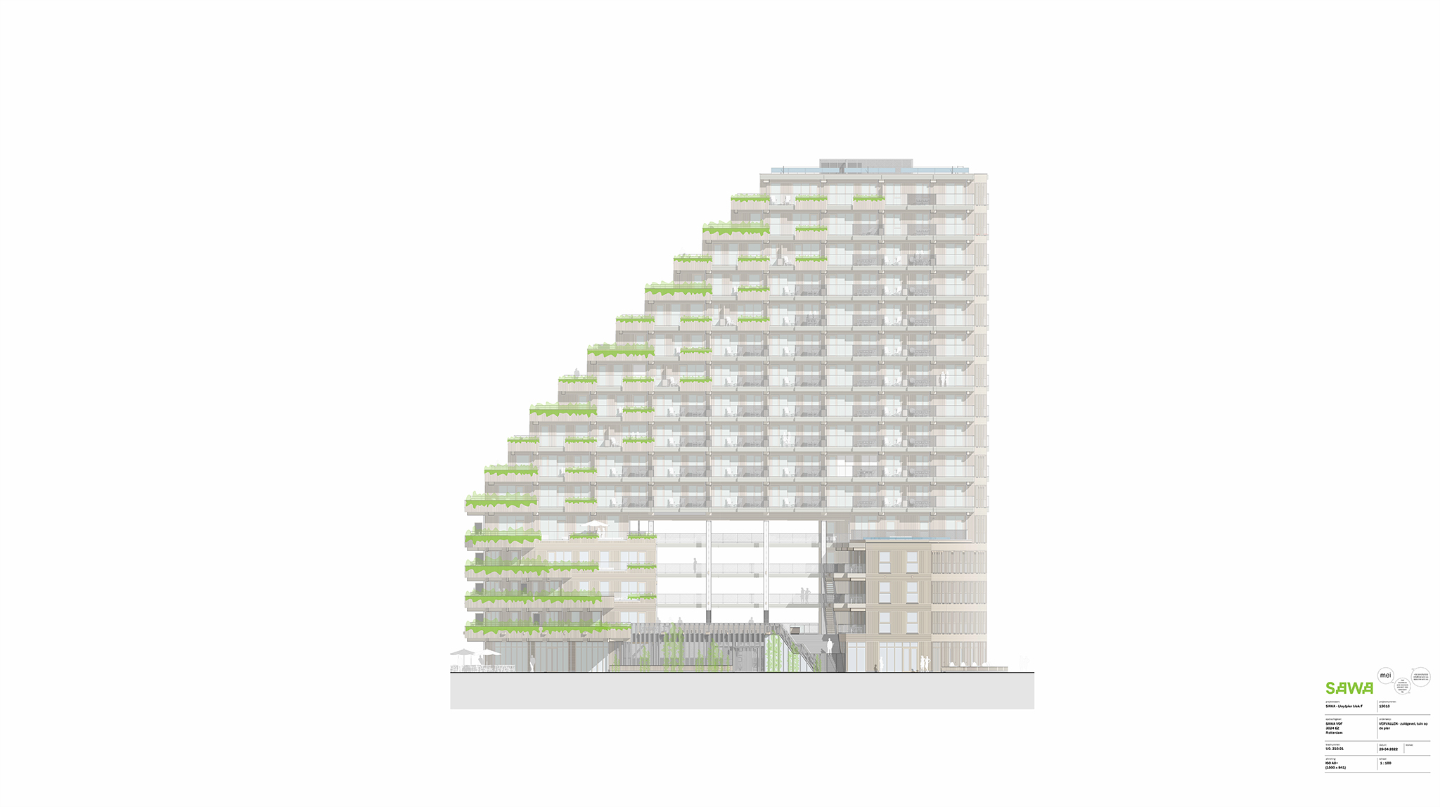 La característica excepcional de SAWA es que el edificio está construido íntegramente en CLT (madera contralaminada), con el uso mínimo de hormigón. Esto convierte a SAWA en el primer edificio residencial de madera de altura completa en Róterdam. El edificio se distingue por sus amplias terrazas verdes, que evocan la historia del lugar y, al mismo tiempo, refuerzan la biodiversidad del barrio.