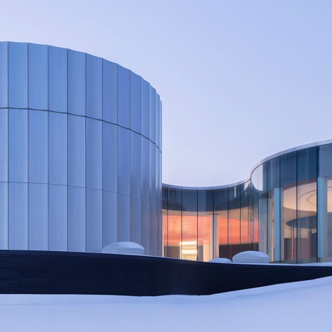 Desde el exterior, el edificio aparece como una serie de cilindros estriados, envueltos en un faldón de vidrio. Los cilindros varían en altura dependiendo de la función interna. Están revestidos con paneles de aluminio plateado que reflejan suavemente el cielo y el paisaje circundante.