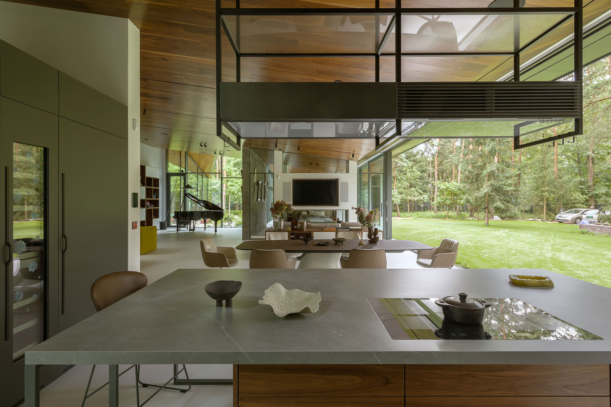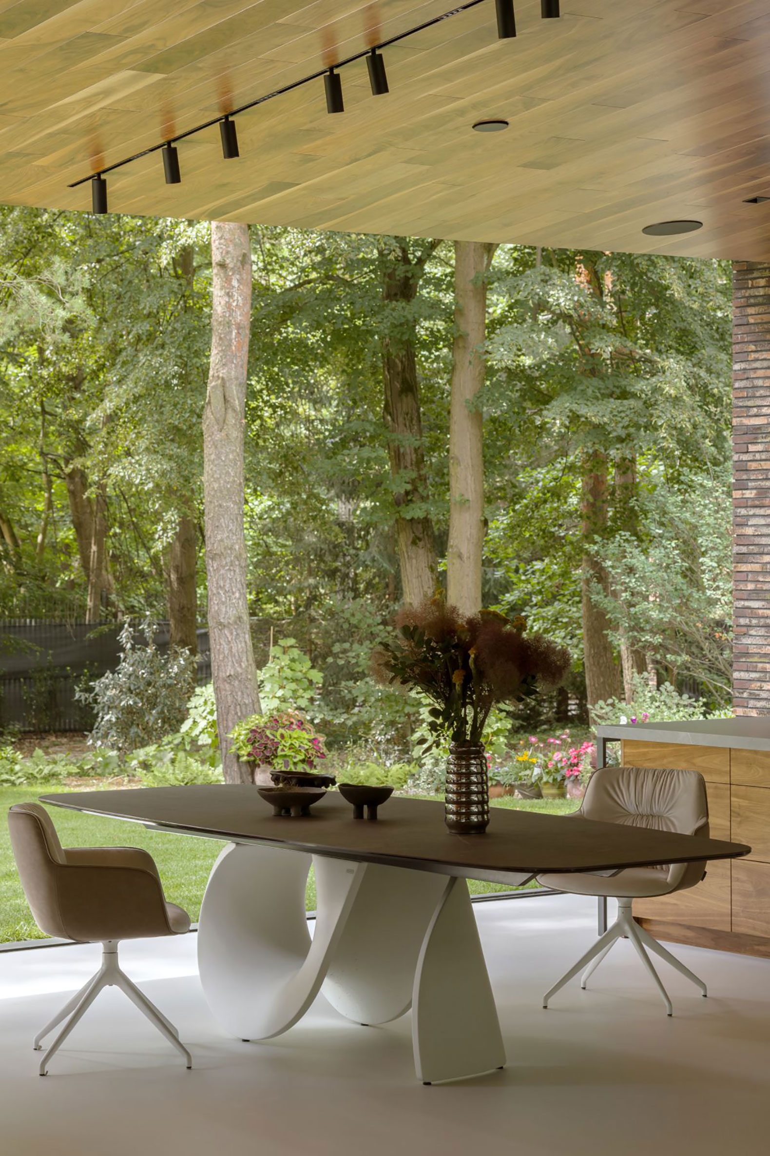 Esta idea se convirtió en el punto de partida del proyecto. Una casa de una sola planta, organizada completamente a nivel del suelo, oculta bajo una amplia cubierta con geometría de tienda de campaña, diseñada para que sus habitantes siempre estuvieran juntos. Los Sadowski deseaban que su casa permaneciera abierta a la naturaleza circundante, arraigada en la tierra. De ahí la estructura acristalada que difumina la frontera entre interior y exterior. En su centro, los arquitectos diseñaron un atrio con un jardín interior y una cubierta de cristal retráctil, que permite a los residentes vivir dentro de la casa y, al mismo tiempo, disfrutar del cielo abierto. Desde el este y el oeste, dos semipatios recortan el volumen, atrayendo la vegetación hacia el interior. A petición de los propietarios, se añadió una ventana corredera panorámica de 22 metros de largo, abriendo el espacio habitable hacia el bosque y fusionando la casa con el jardín. Las paredes móviles y el techo practicable permiten una interacción fluida entre la luz y el espacio, a la vez que crean ventilación natural, funcionando de forma similar a un tipi. Con la circulación del aire, el viento transporta los sonidos y aromas del bosque.