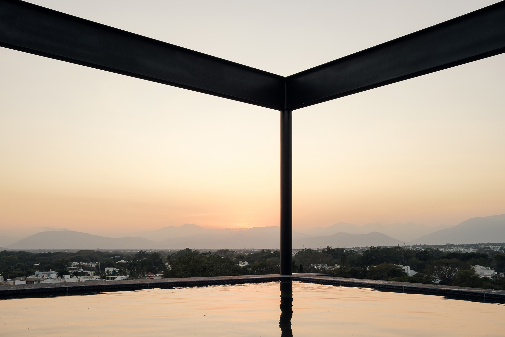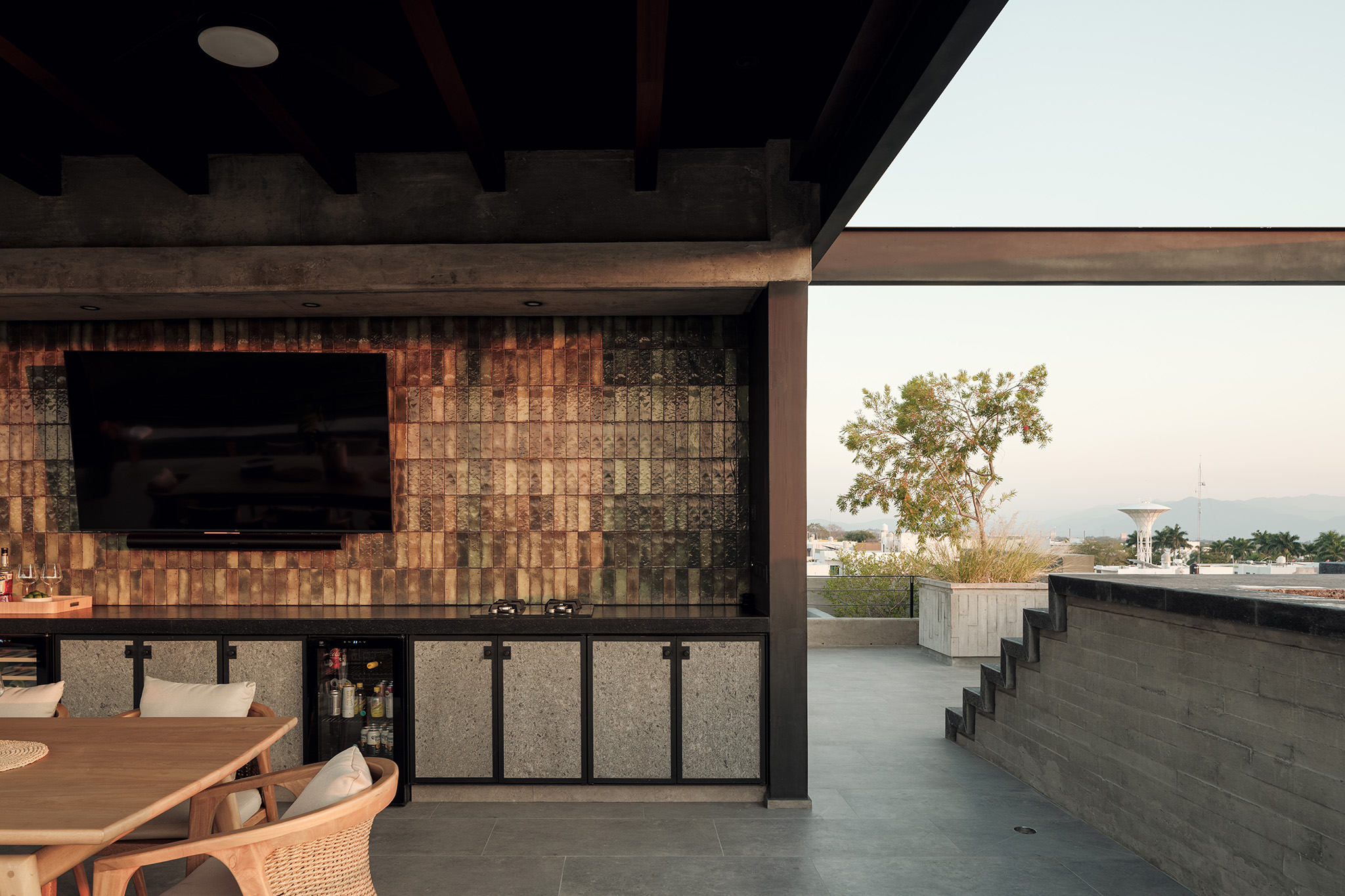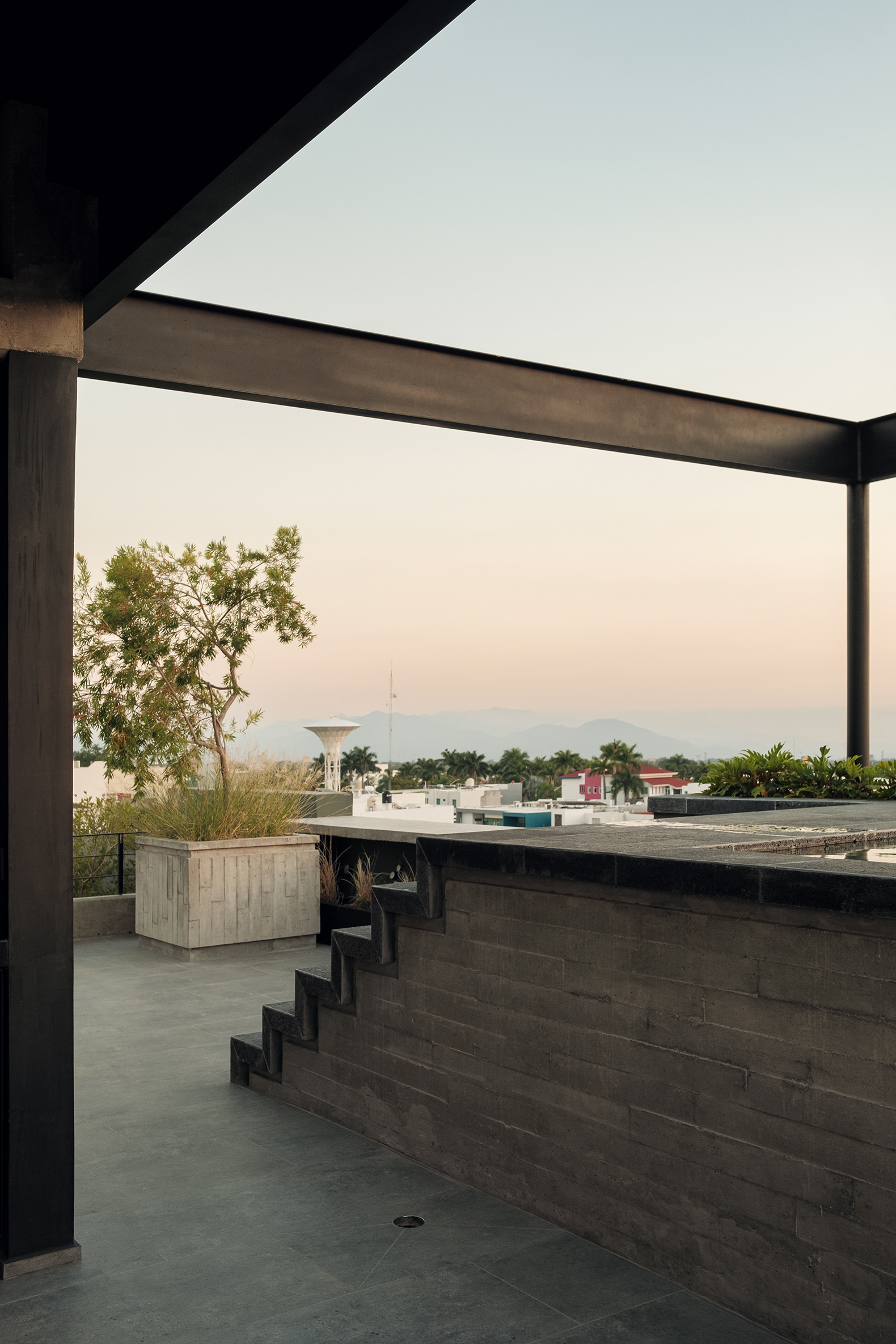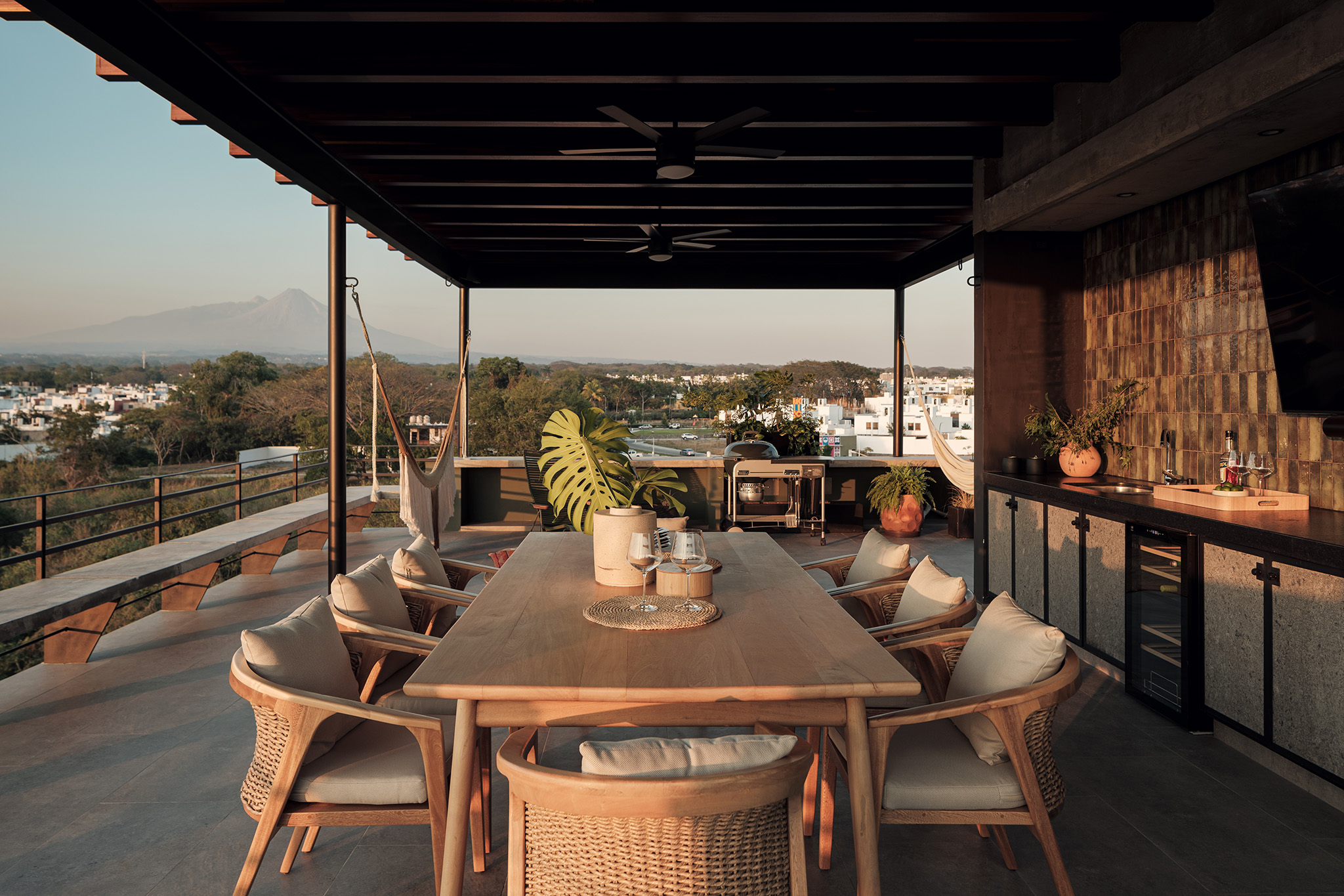 La ubicación estratégica de la torre ofrece un diálogo constante con el paisaje. Hacia el norte, los residentes pueden deleitarse con la imponente vista del Volcán de Colima, un recordatorio de la fuerza y la quietud de la naturaleza. Al sur, la ciudad de Colima se despliega, ofreciendo un contraste vibrante y dinámico. La fachada delantera de la torre, flanqueada por un pequeño jardín y otro arroyo, asegura que no haya vecinos inmediatos, reforzando la sensación de retiro y privacidad.