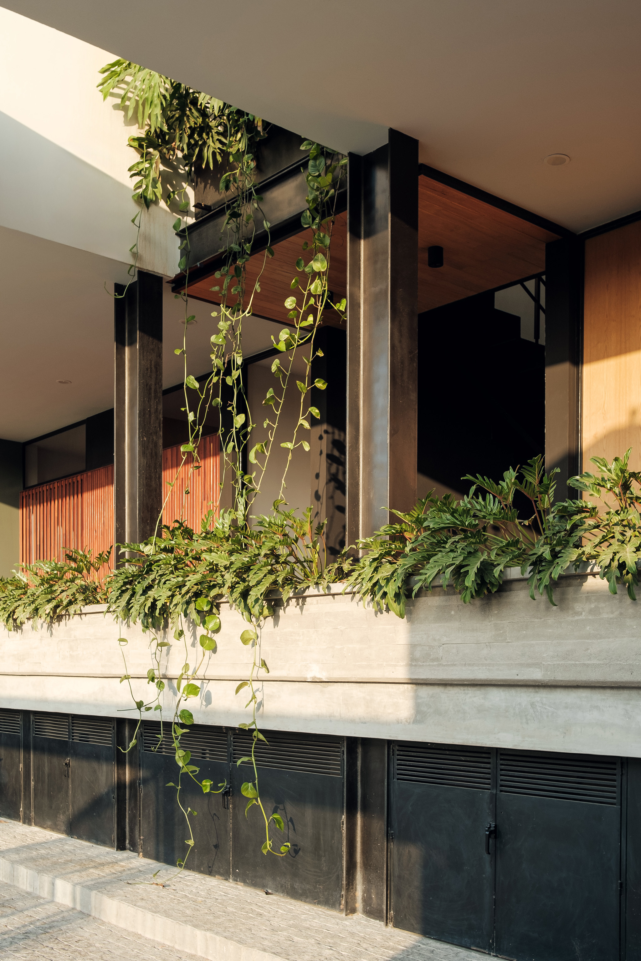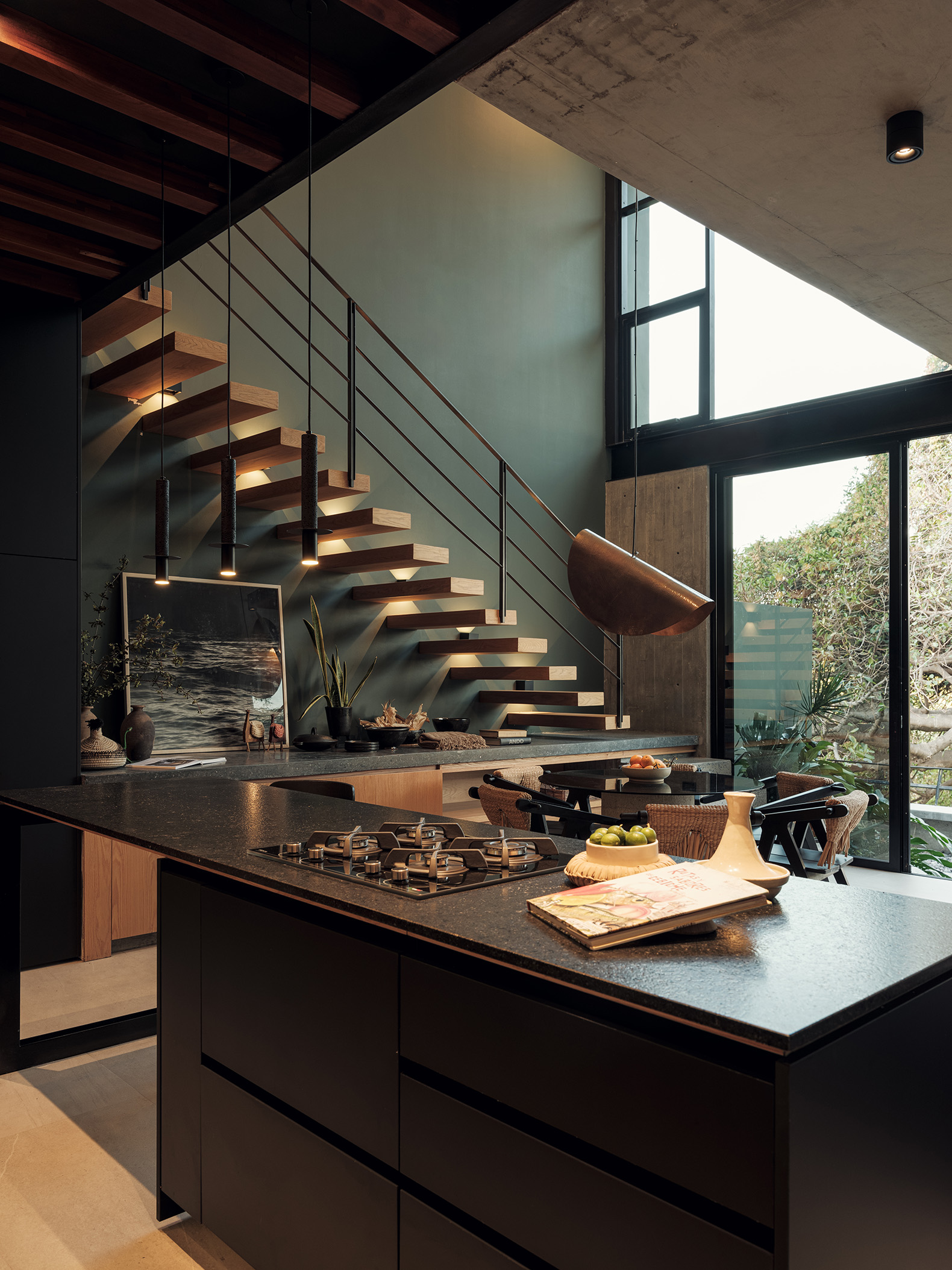 Formalmente, el proyecto realizado por Di Frenna Arquitectos combina vigas de hormigón visto con un sistema de ventanas y balcones que busca difuminar los límites entre el interior y el exterior. En el corazón del conjunto, la sucesión de espacios habitables se articula a través de una escalera metálica.