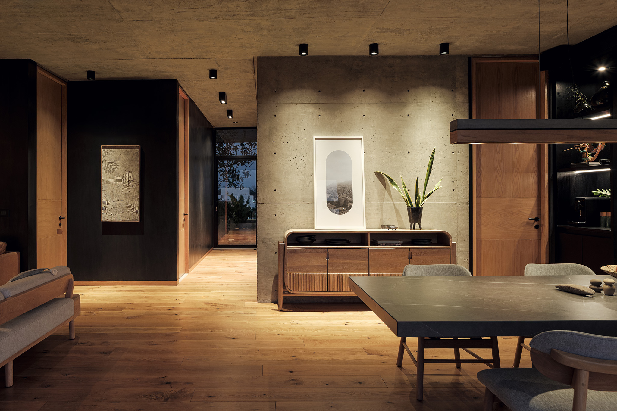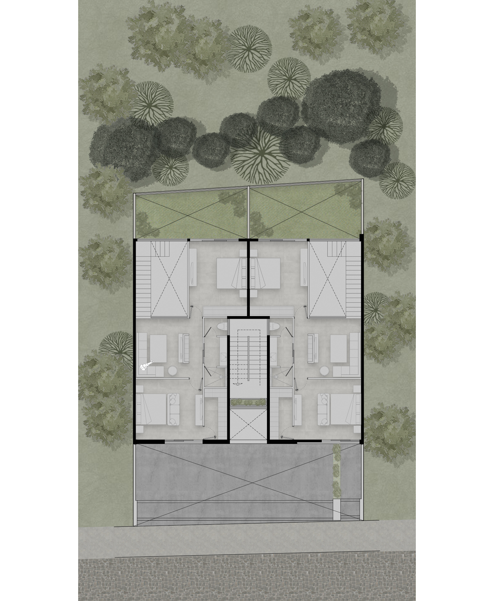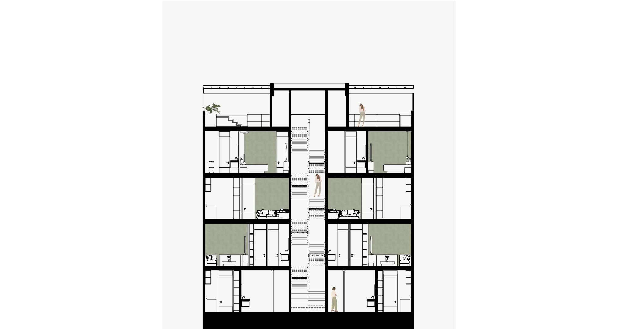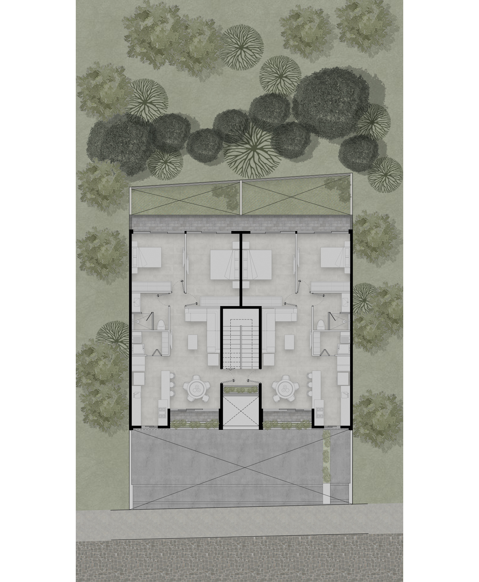 El proyecto de los interiores está concebido para reflejar una vida equilibrada y serena. En los primeros dos niveles, dos departamentos dúplex de dos habitaciones se destacan por sus espacios en doble altura y escaleras voladas. Estos elementos crean una sensación de amplitud y libertad, invitando a la luz natural a inundar los espacios. Cada dúplex incluye una sala, comedor, cocina, baño social y área de servicio en la planta baja, mientras que la planta alta alberga dos dormitorios con baño compartido y una sala de televisión.