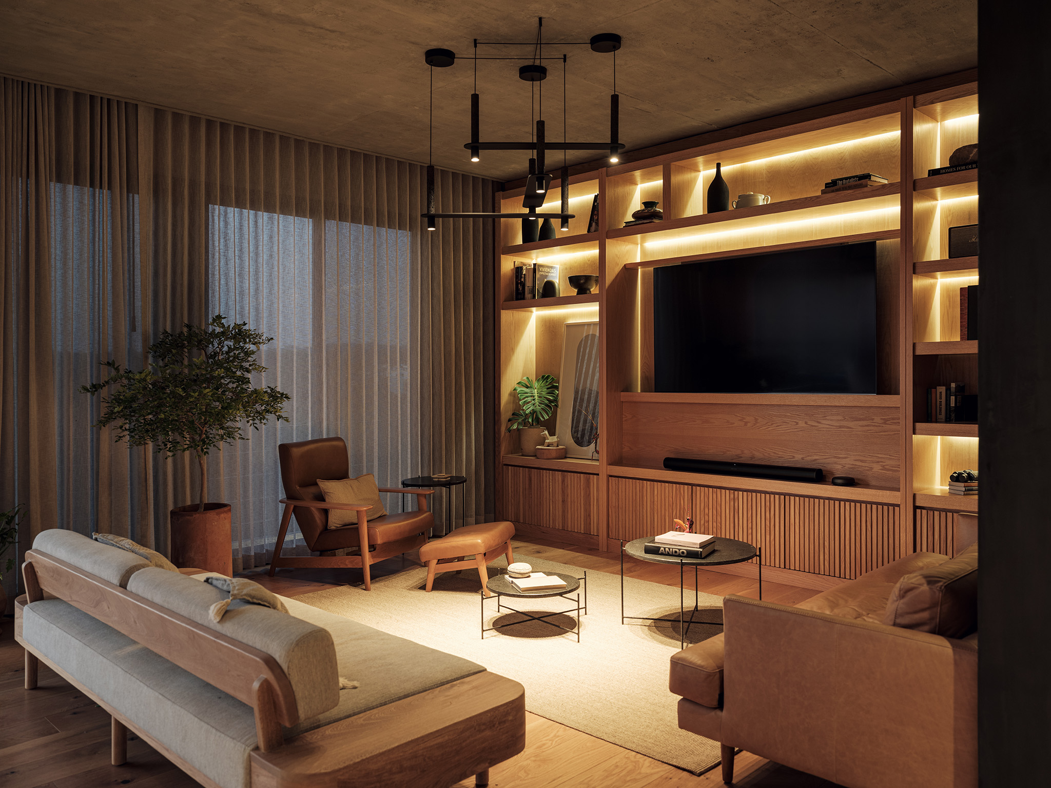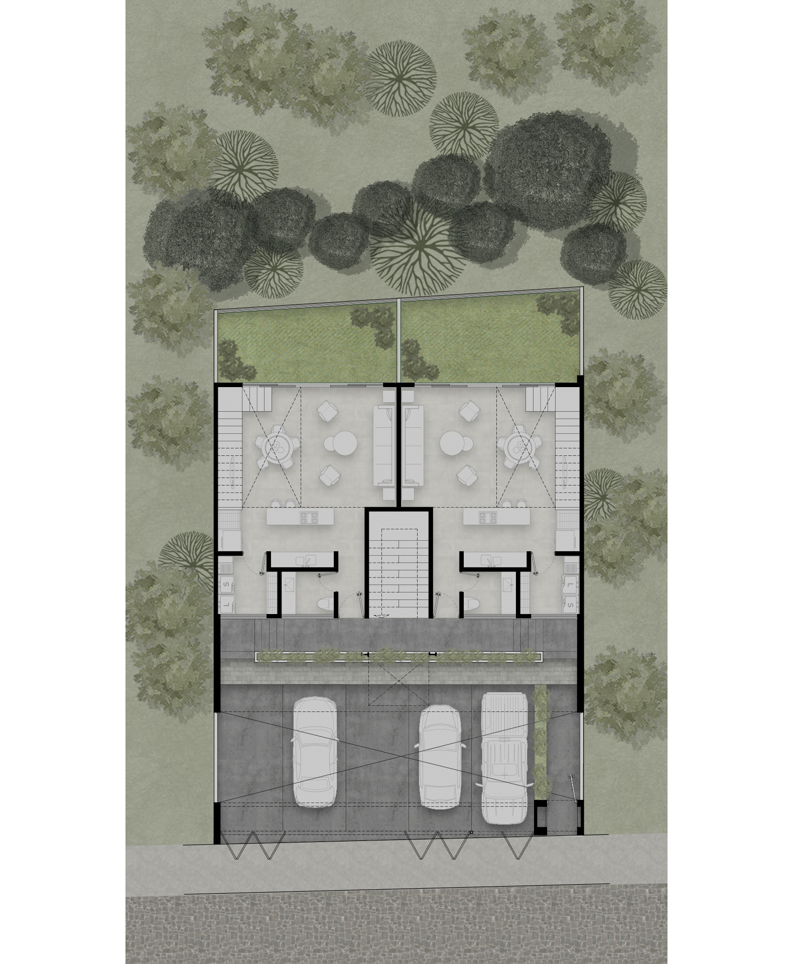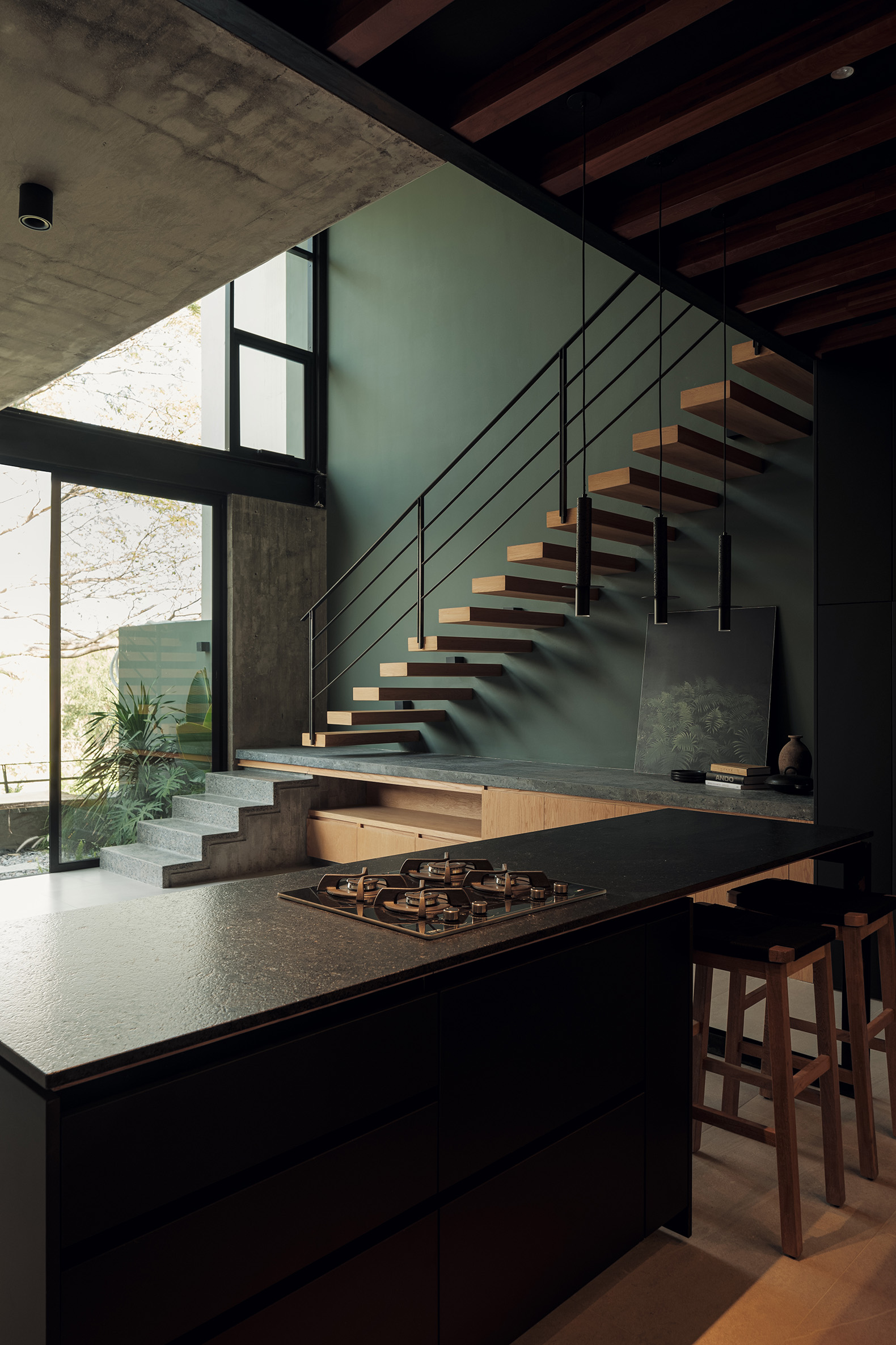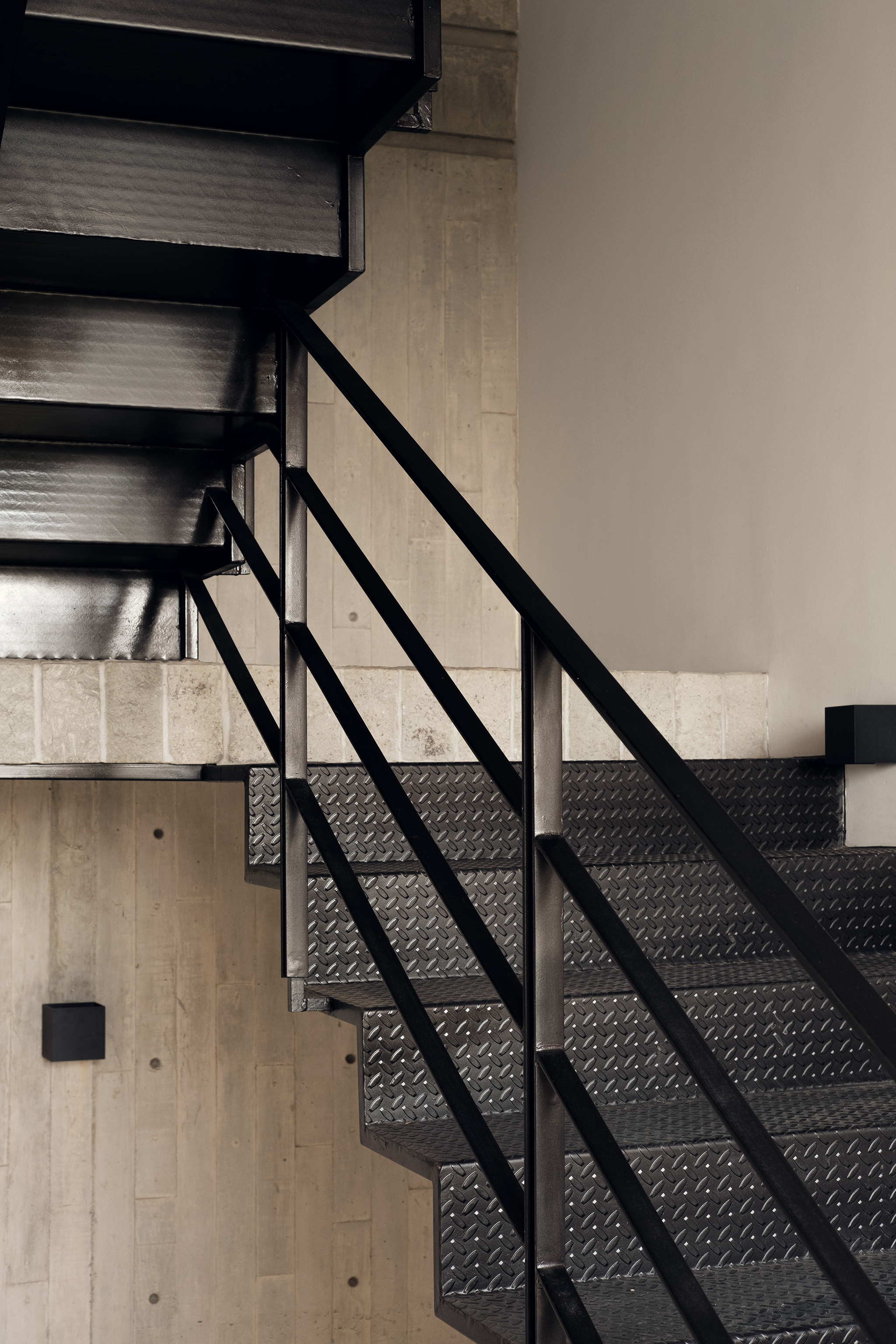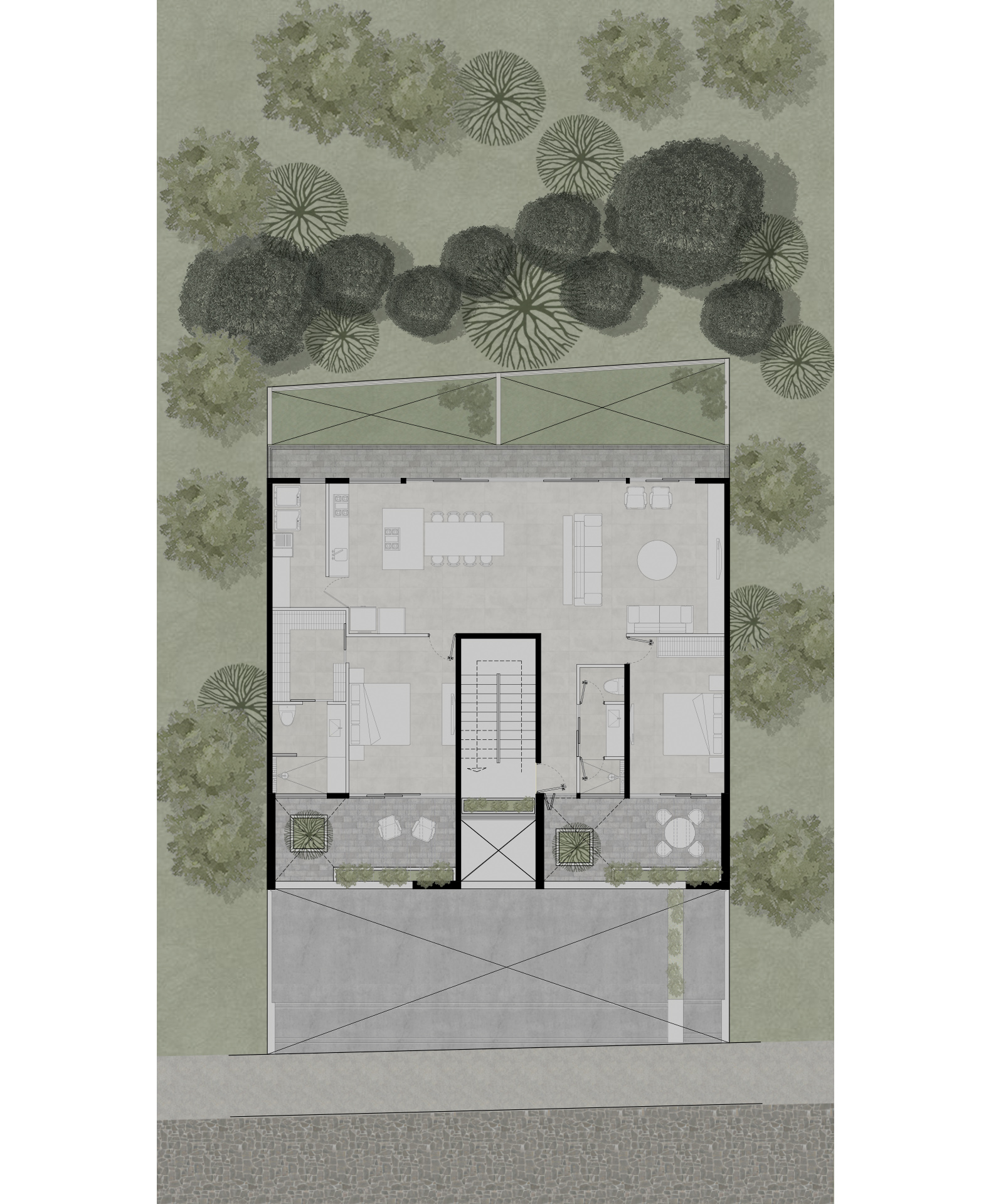 El proyecto de los interiores está concebido para reflejar una vida equilibrada y serena. En los primeros dos niveles, dos departamentos dúplex de dos habitaciones se destacan por sus espacios en doble altura y escaleras voladas. Estos elementos crean una sensación de amplitud y libertad, invitando a la luz natural a inundar los espacios. Cada dúplex incluye una sala, comedor, cocina, baño social y área de servicio en la planta baja, mientras que la planta alta alberga dos dormitorios con baño compartido y una sala de televisión.