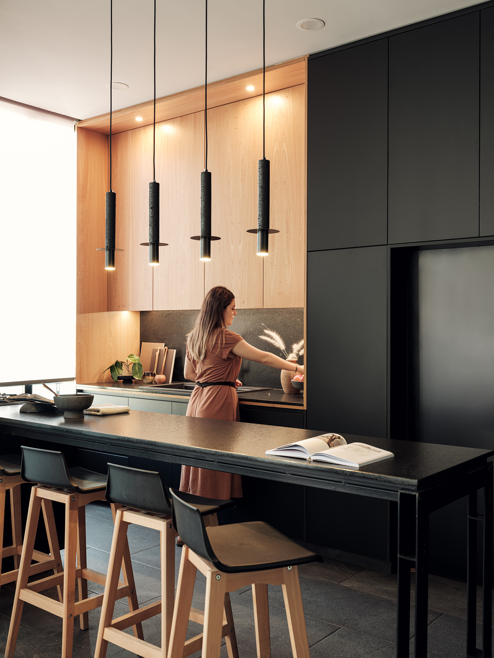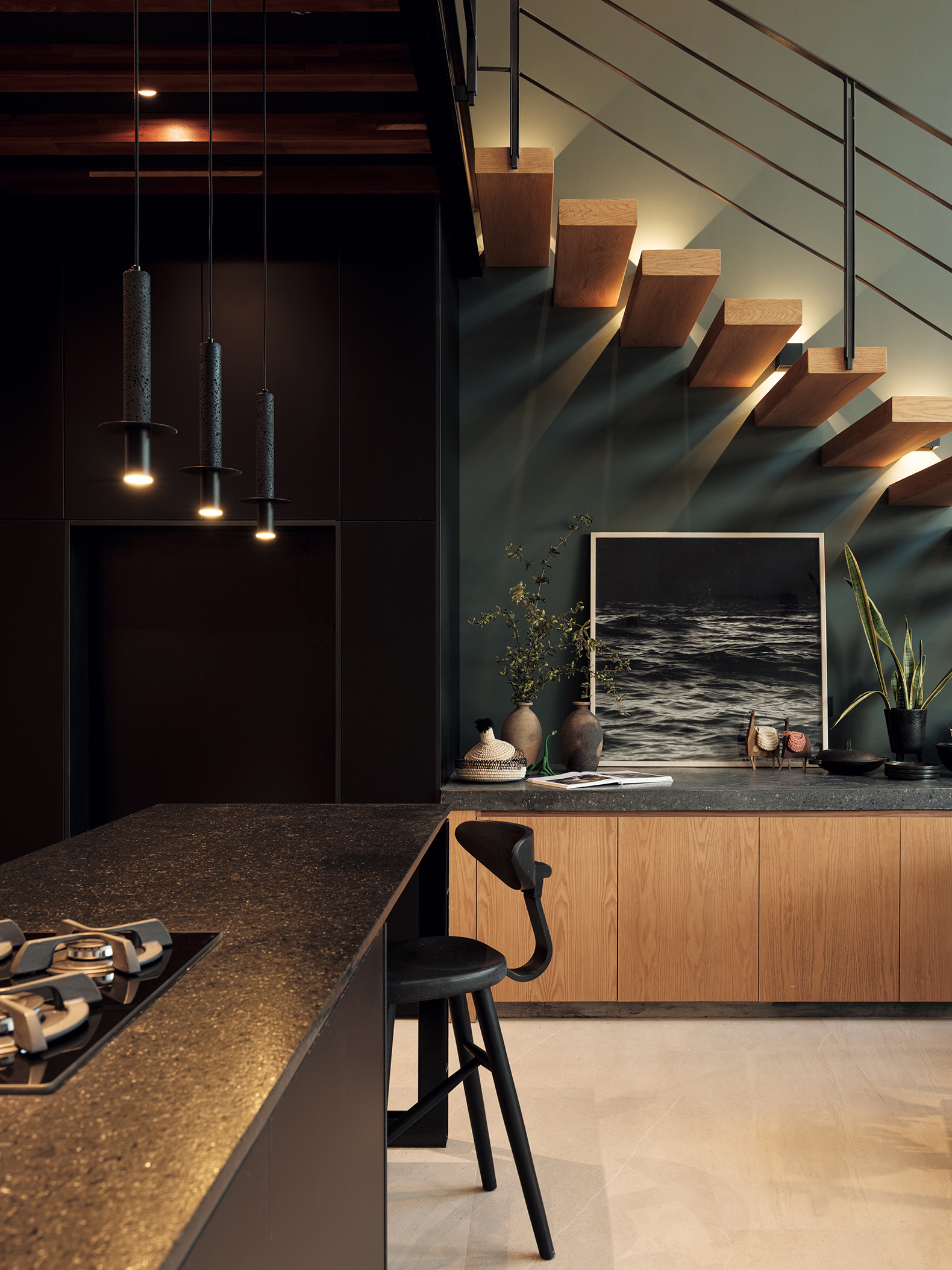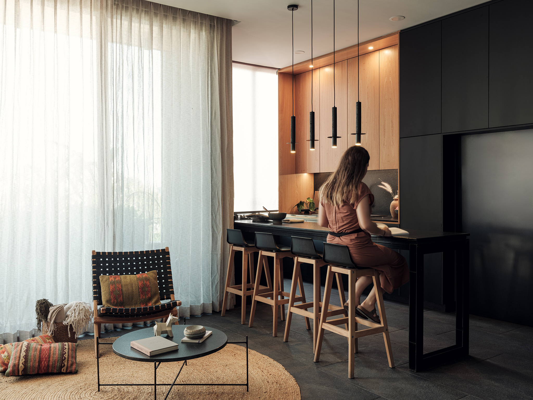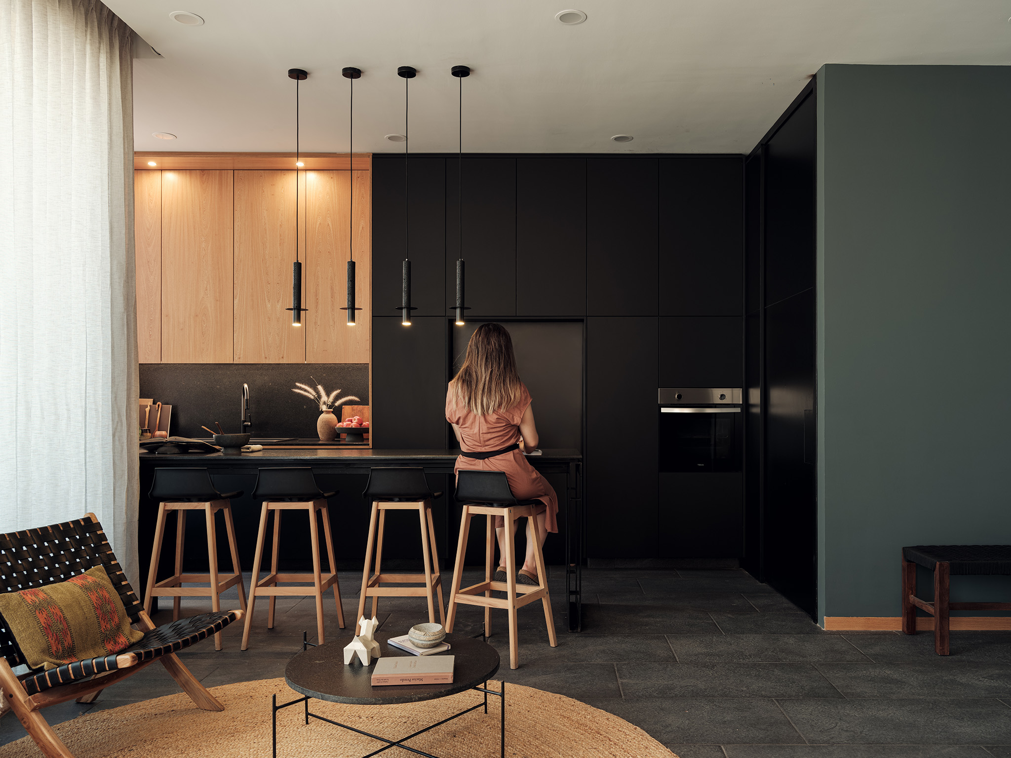 El proyecto de los interiores está concebido para reflejar una vida equilibrada y serena. En los primeros dos niveles, dos departamentos dúplex de dos habitaciones se destacan por sus espacios en doble altura y escaleras voladas. Estos elementos crean una sensación de amplitud y libertad, invitando a la luz natural a inundar los espacios. Cada dúplex incluye una sala, comedor, cocina, baño social y área de servicio en la planta baja, mientras que la planta alta alberga dos dormitorios con baño compartido y una sala de televisión.