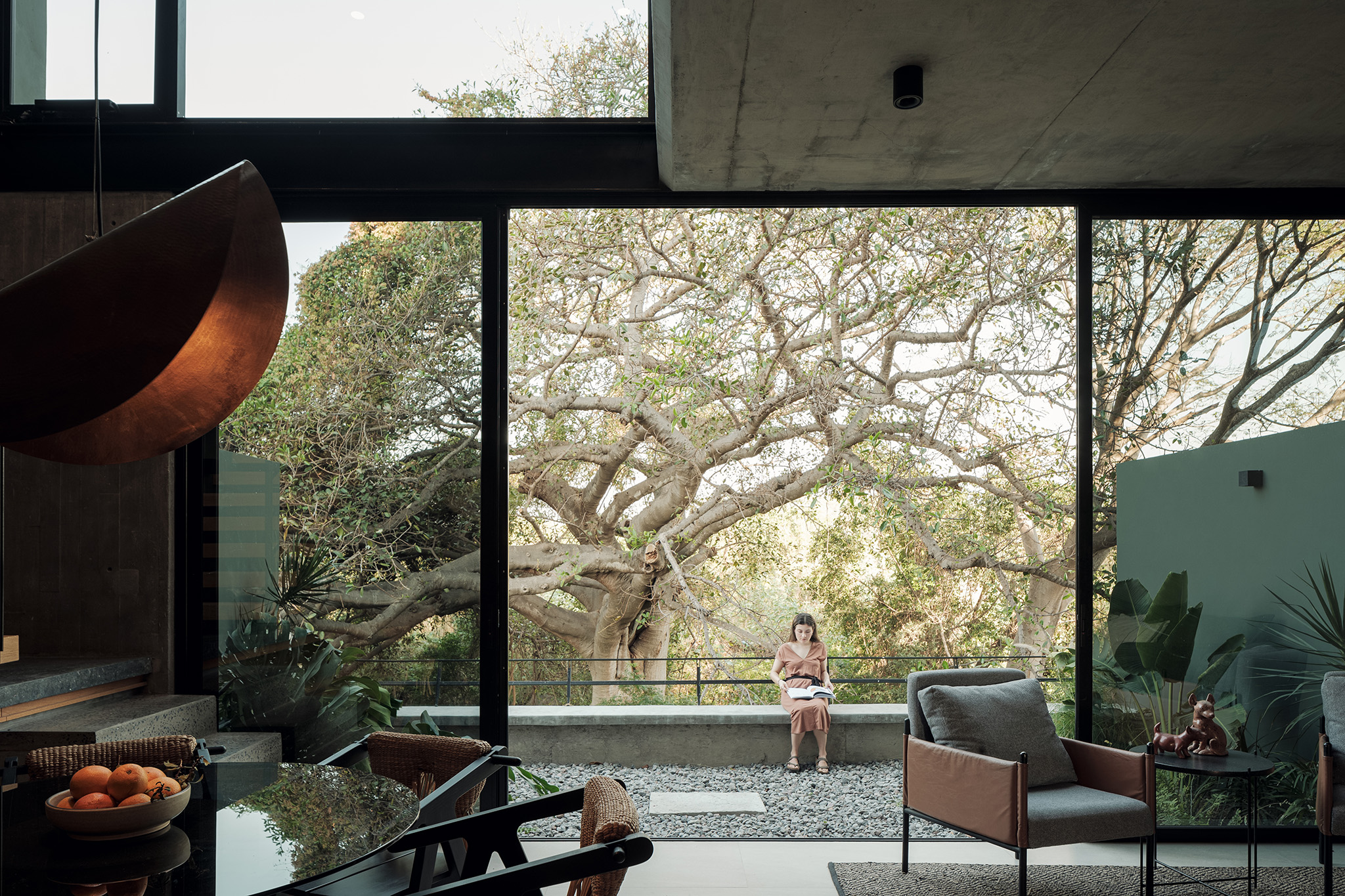 Desde su concepción, el proyecto se proyectó teniendo en mente la belleza natural y la serenidad del sitio. El terreno, delimitado por arroyos que fluyen casi todo el año, está envuelto en un abrazo verde formado por majestuosos árboles de Parotas, Higueras, Primaveras y Palmeras. Estos elementos no solo embellecen el paisaje, sino que también brindan privacidad, una cualidad cada vez más preciada en nuestro mundo moderno.