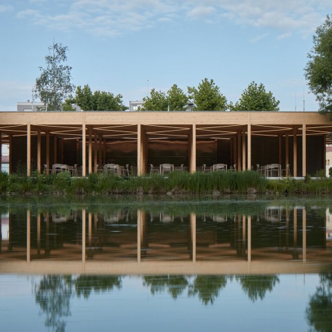 El edificio existente del restaurante, una estructura de madera construida hacia 1970, no cumplía los requisitos técnicos ni espaciales actuales. Hemos diseñado una sencilla estructura de madera para un nuevo restaurante-jardín de temporada en el mismo lugar, en contacto directo con el agua. Los delicados pilares de madera confieren a toda la estructura ligereza y permiten una máxima conexión del espacio interior con su entorno. La organización espacial se basa en un módulo de un cubo con una longitud de 3 m. El porche cubierto ofrece muchas posibilidades de disposición de los asientos.