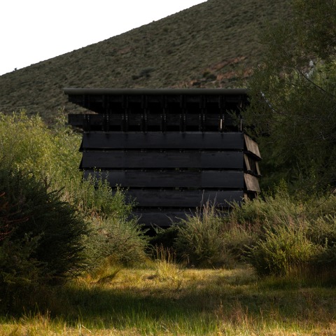 La propuesta de OMNO Lab se inspira en la arquitectura tradicional de las residencias tibetanas, por lo que en la estructura de la cabaña se ha utilizado madera carbonizada negra, con el fin de integrarla en el bosque adyacente y generar un distintivo símbolo oscuro. Además, uno de los objetivos era que las personas que la observaran desde lejos percibieran la simetría del edificio, para luego descubrir su intencionada asimetría interior.