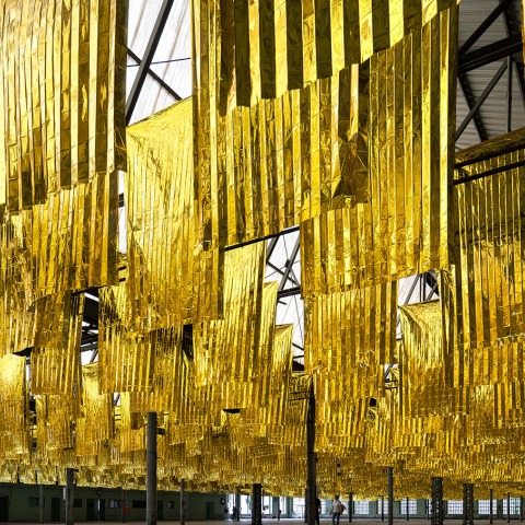 Esta intervención artística está compuesta por cientos de mantas de salvamento, formando un mar de oro y plata de apariencia siempre cambiante. La obra se activa mediante las corrientes de viento que atraviesan el espacio, creando patrones ondulatorios y solemnes campos sonoros en un ciclo coreográfico continuo. Esta interacción convierte la instalación en una entidad viva, en constante movimiento evolutivo.