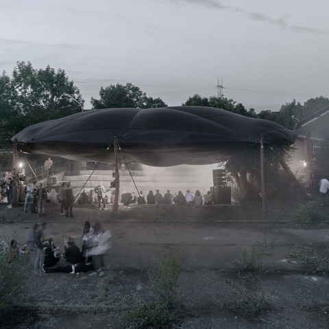 El proyecto para un pabellón de espectáculos en el Festival de Artes y Música de Horst se inspira en la arquitectura antigua de celebraciones míticas e hitos espirituales. El simple hecho de poner un gran techo flotante transforma un corte cuadrado de hormigón en un terreno que se transforma en una pista de baile y un escenario central para sonidos experimentales y representaciones artísticas. La estructura juega con un aspecto aparentemente contradictorio de delgadez y grosor, ingravidez y una imagen de pesadez.