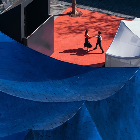 La elección de estructuras, materiales y morfología del lugar, sirvió como marco entre la trama y el diseño. Las formas onduladas de la cubierta representan las montañas de Khanbaliq, además de asemejarse a una tienda de campaña asentada en el sitio, y el olor cyan del Klein Blue Hills, simboliza la vitalidad, convirtiéndose en algo clave en el proyecto.