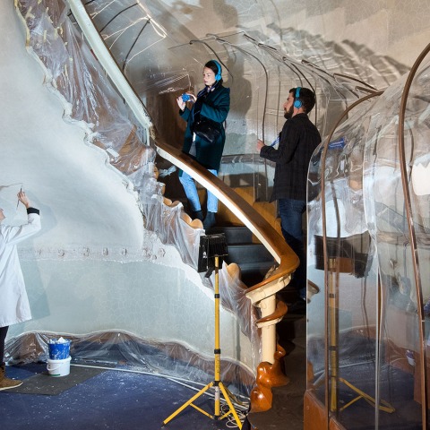 Debido a la complejidad de la petición, se procedió a construir un "túnel transparente", que en vez de separar o querer esconder el trabajo de los restauradores durante 4 meses, la pusiera en valor y se pudiera observar en directo el tesoro que se escondía detrás la "piel de la casa". Para ello se utilizaron paneles de metacrilato de 10 mm -moldeados acorde a las formas orgánicas de la casa- soportados por unos pies de madera tallados y se iluminaron con leds para poner en valor la transparencia.