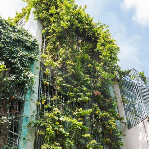 Debido a las circunstancias del sitio, la apertura del edificio estaba físicamente limitada al frente, la parte superior y la parte posterior de la casa. Para ajustar la distancia entre los edificios vecinos y maximizar el área de apertura, envolvimos las tres superficies mencionadas del edificio con un "velo verde", que está hecho de plantas trepadoras que crecen en una malla de acero. Esta capa suave, como difusor ambiental, filtra la luz solar directa y evita que el espacio interior se sobreexponga al exterior, sin la sensación de aislamiento. Se compone de maceteros en la altura de cada forjado, con elementos modulares de acero galvanizado unidos a él. Esta estructura proporciona una vista verde en toda la casa, que también protege a los residentes del crimen urbano.