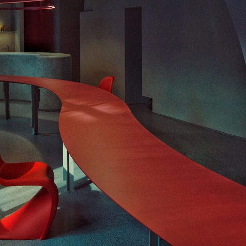 El banco de trabajo se inspira en el hilo de Ariadna que ayudó a Teseo a encontrar la salida del laberinto de la mitología griega. Su superficie roja aerodinámica penetra el área debajo del techo abovedado, agregando suavidad y libertad al espacio.