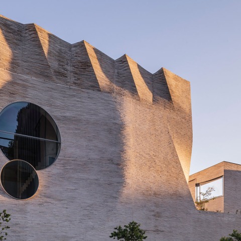 La superficie exterior de ladrillo es un elemento vinculante del edificio en general, encontrando una expresión singular para contener los diversos mundos interiores en su interior. La pared se inclina, las curvas y los escalones de DBJ para un jardín en la calle y una ventana de nube con múltiples figuras.