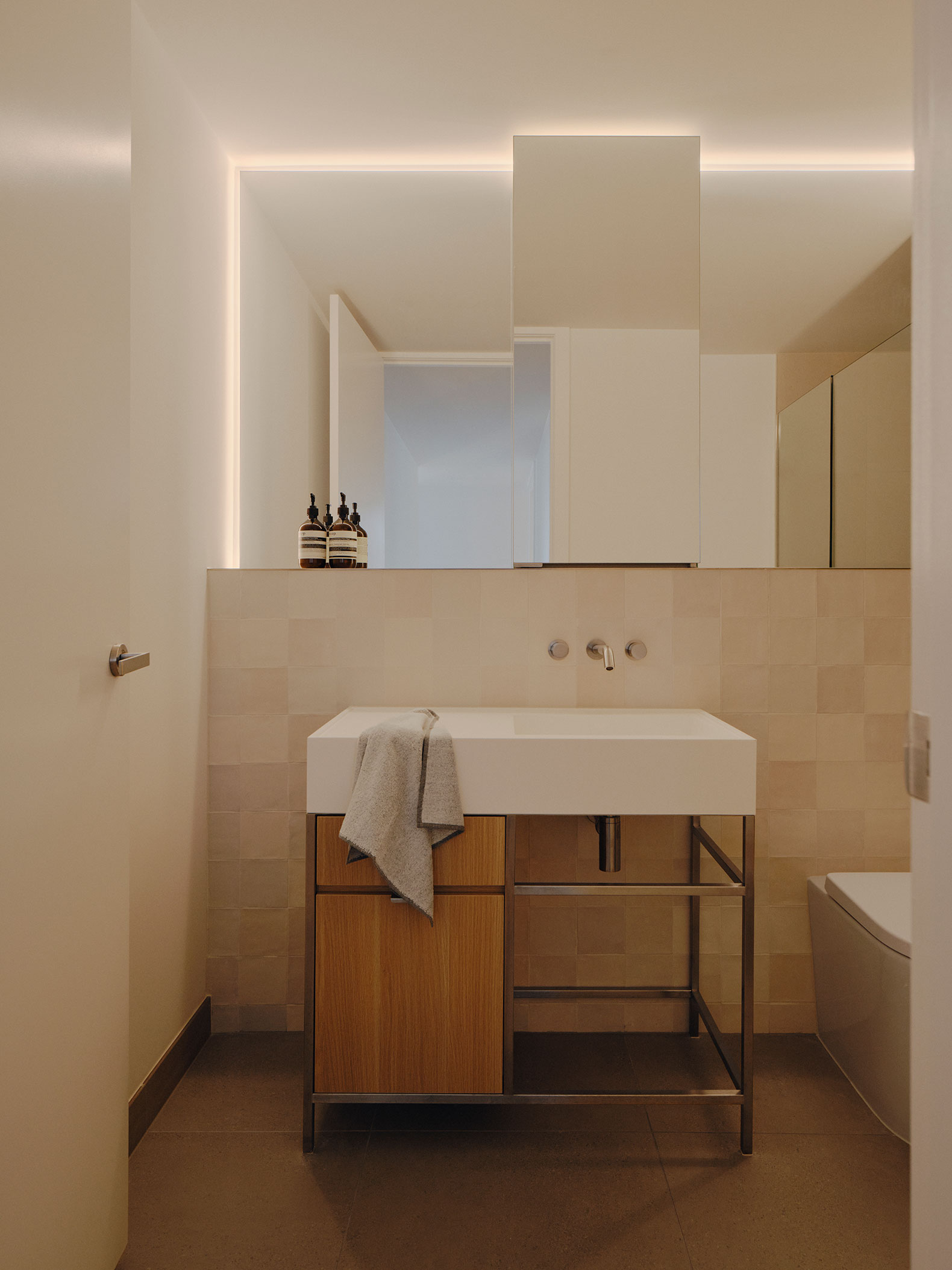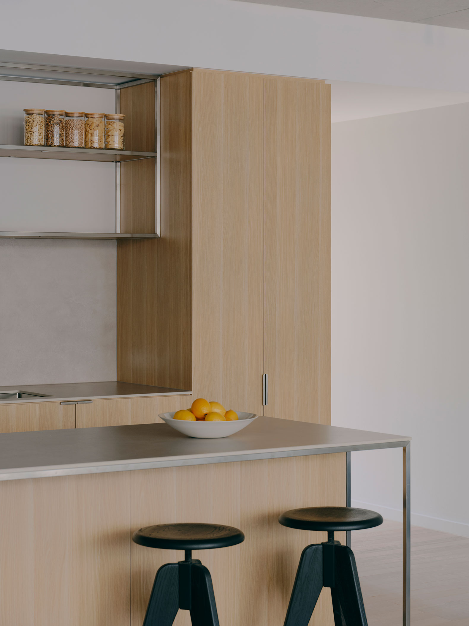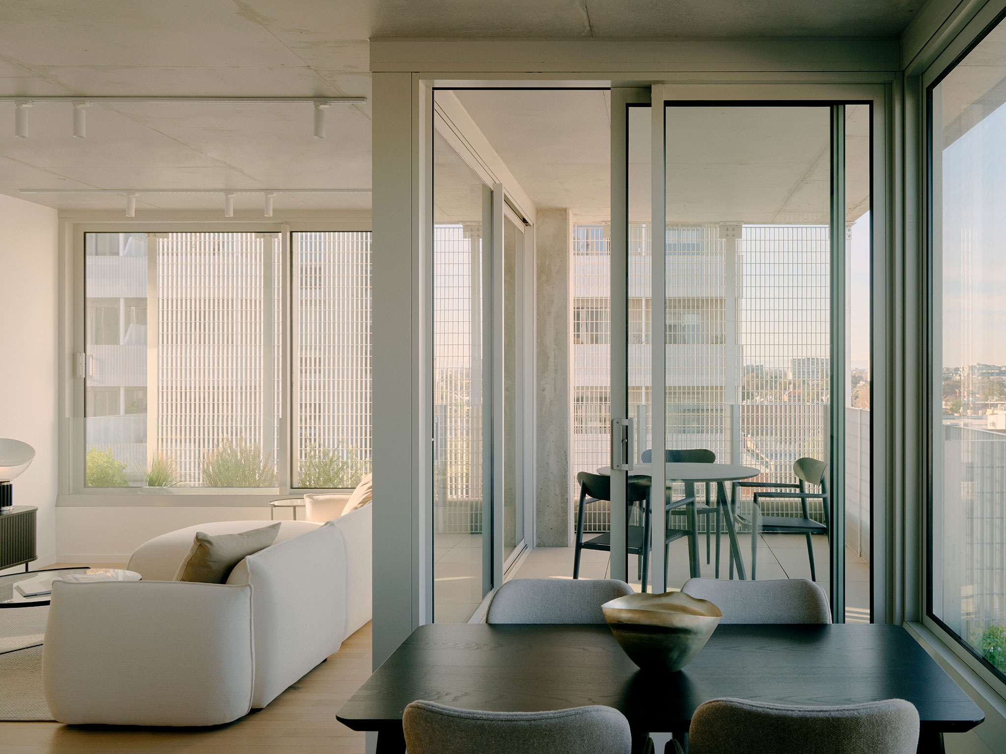 En el corazón de Brunswick Yard, como en todos los proyectos de Carr, se encuentra un enfoque integral. Con Carr supervisando tanto la arquitectura como los interiores de los 122 apartamentos en ocho plantas, se logra una clara continuidad entre el exterior y el interior. Las líneas limpias y las formas simples que definen la fachada se extienden a los interiores, creando un lenguaje de diseño consistente y una experiencia espacial cuidadosamente estudiada, enriquecida por una diversa gama de tipos de apartamentos.