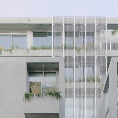 La malla de acero se utiliza en todo el proyecto con fines funcionales y estéticos, sirviendo como balaustrada, pantalla y estructura de soporte para la vegetación. Originalmente explorada en proyectos anteriores como método para controlar las líneas de visión y cumplir con las normas de visibilidad, la malla se aplica aquí a una escala mucho mayor. También funciona como sustrato de plantación, permitiendo que las enredaderas trepen y suavicen la forma arquitectónica con el tiempo.
