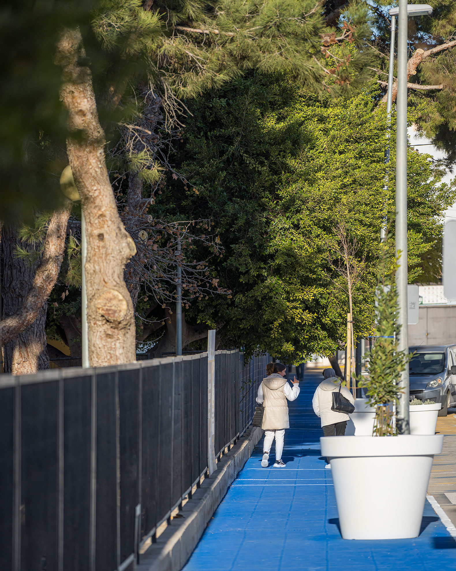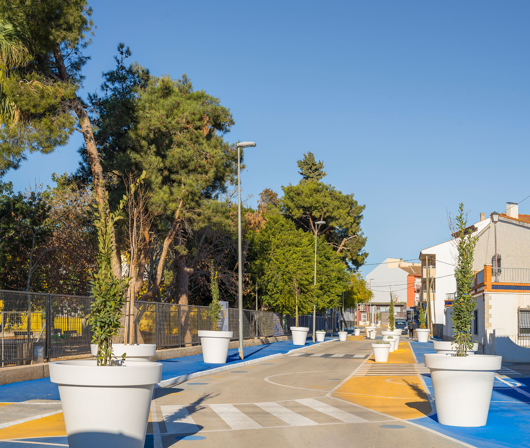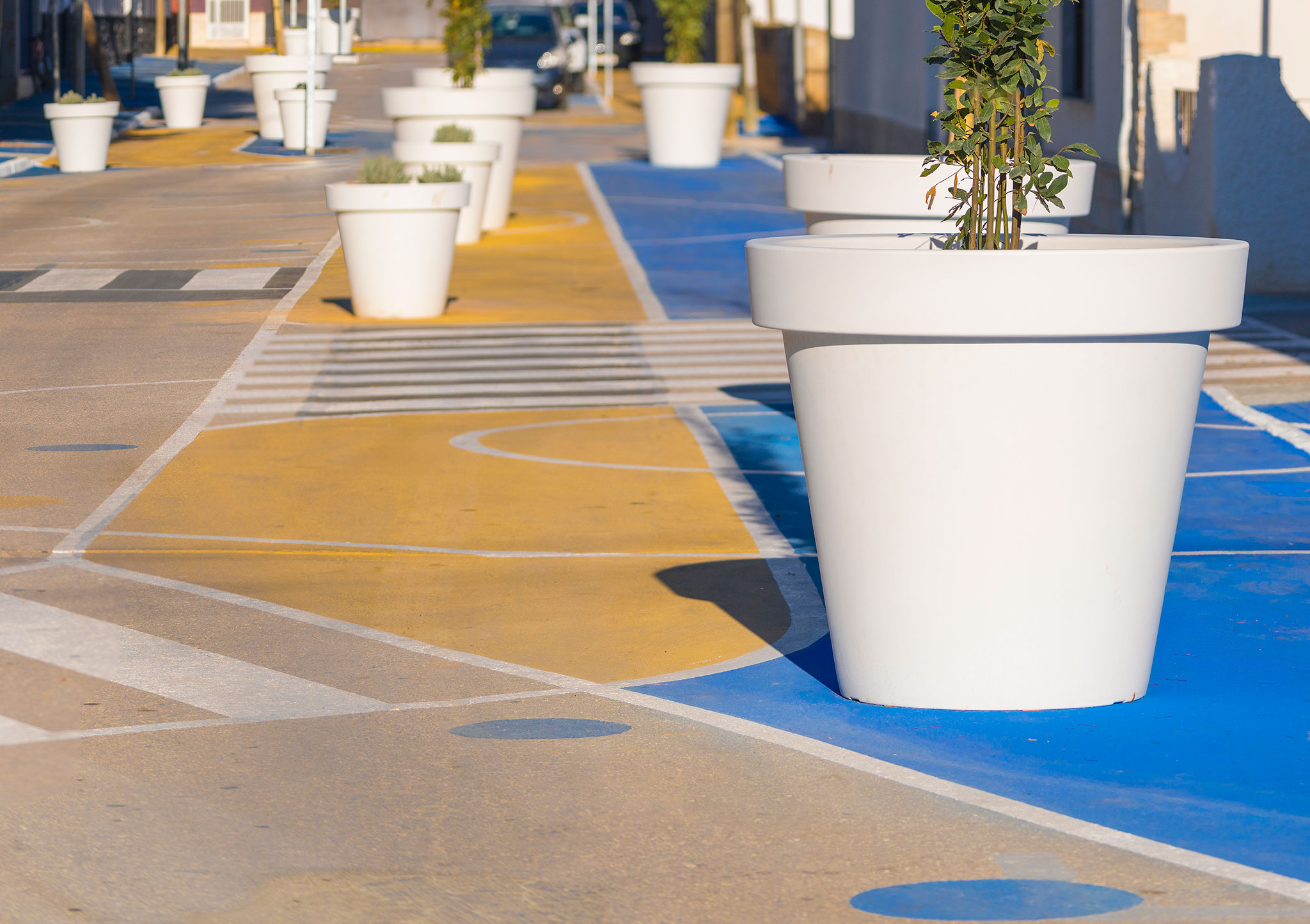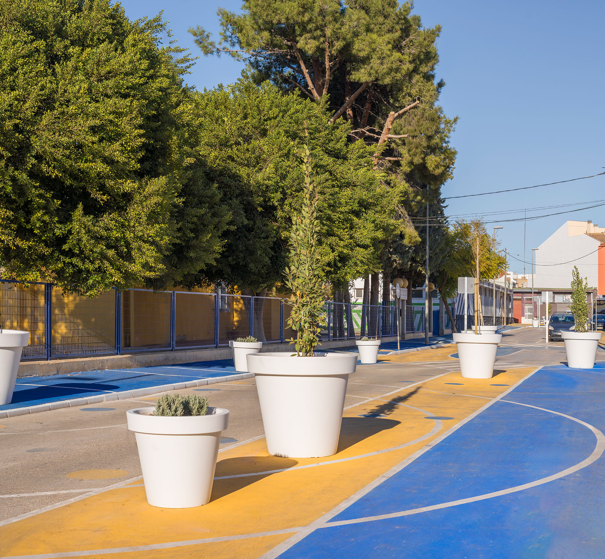 La incorporación de maceteros de gran escala, inspirados en las macetas de barro tradicionales del sureste peninsular, cumple una doble función: regular el tránsito y generar identidad. Dispuestos en puntos clave, estos elementos actúan como filtros que guían los recorridos y generan zonas de sombra, estancia y encuentro.