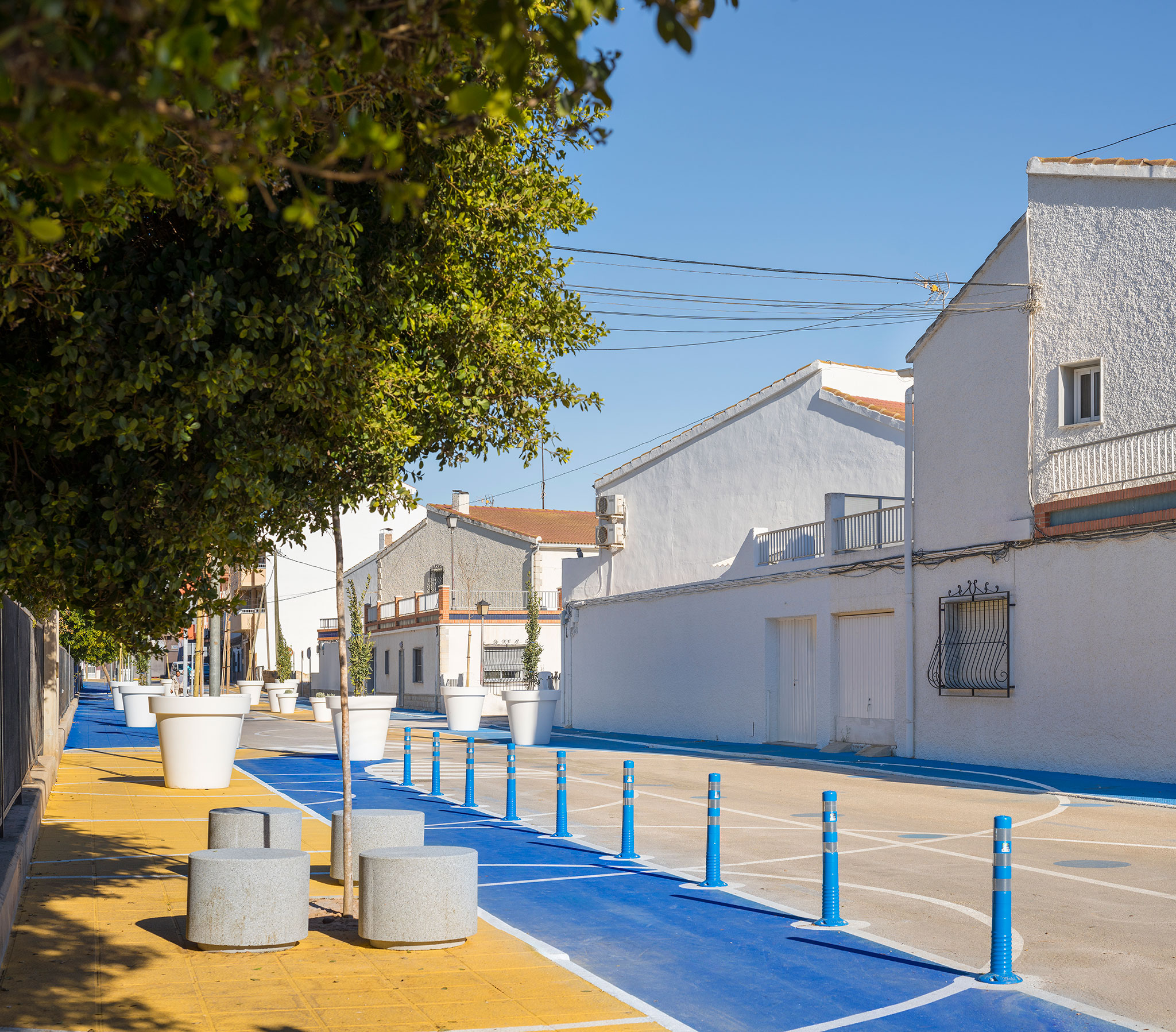 La calle Miguel de Cervantes, de trazado recto y sección vehicular dominante, conecta equipamientos clave del municipio como el IES Luis Manzanares y la Escuela Oficial de Idiomas. Frente al desequilibrio entre tráfico rodado y uso peatonal, el Ayuntamiento plantea esta intervención como un experimento urbano para poner a prueba otra forma de habitar el espacio común.