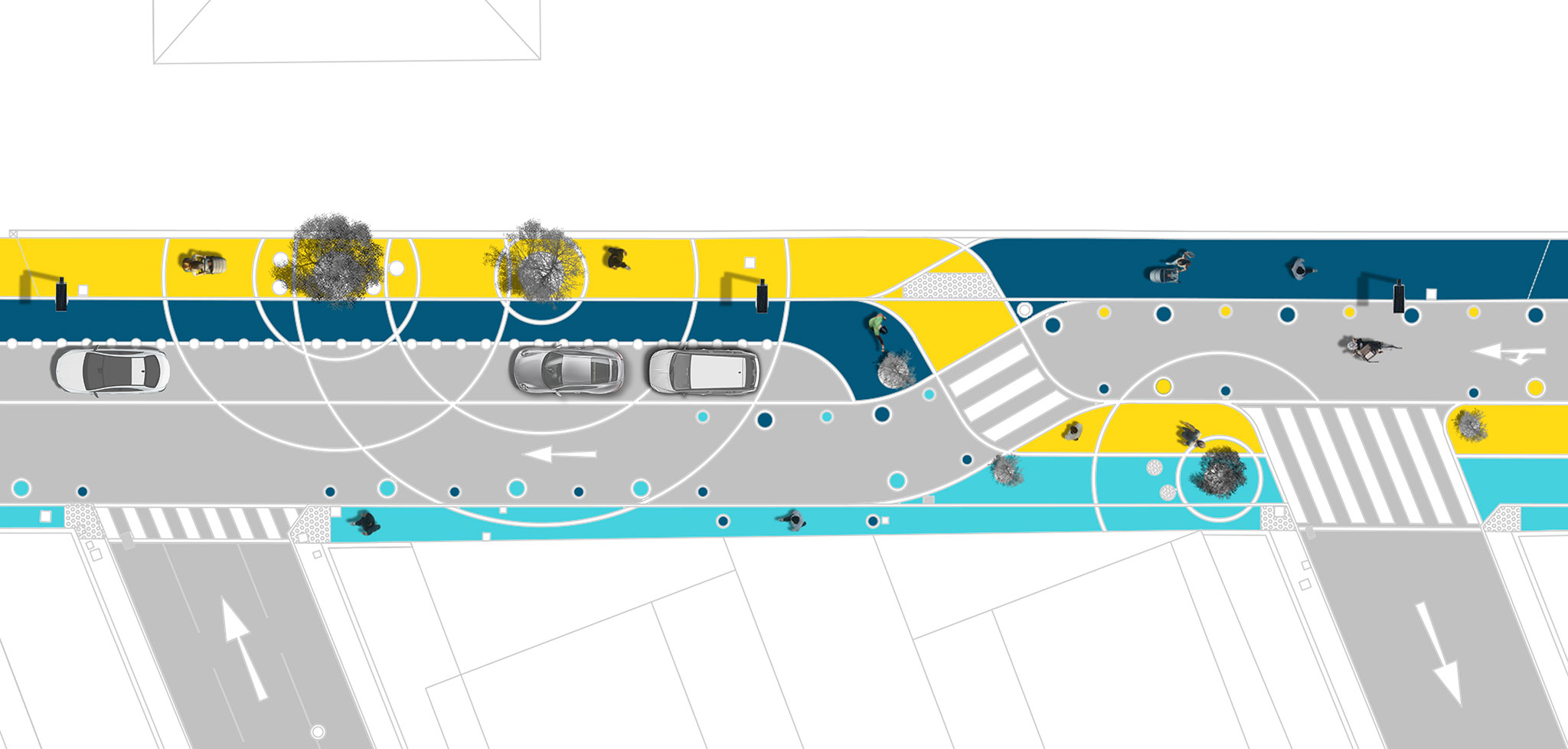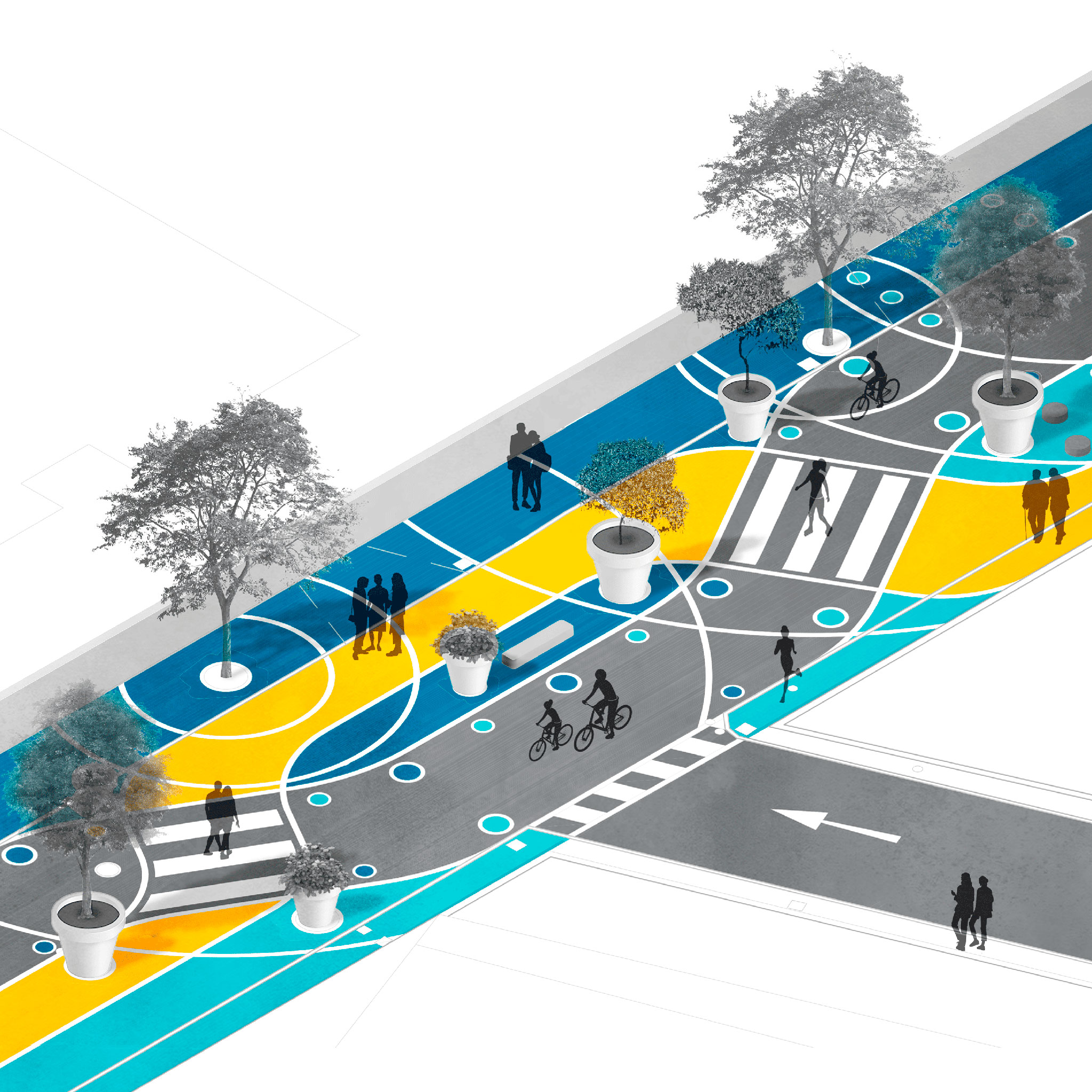 La estructura formal de la calle se transforma mediante marcas viales, recorridos peatonales intercalados y un sistema de mobiliario que, como comentan los arquitectos, «altera la lógica del desplazamiento lineal». El objetivo intenta ralentizar el tráfico mediante geometrías complejas y recorridos trenzados, que facilitan un diálogo entre vehículos y peatones en el uso equitativo del espacio urbano.