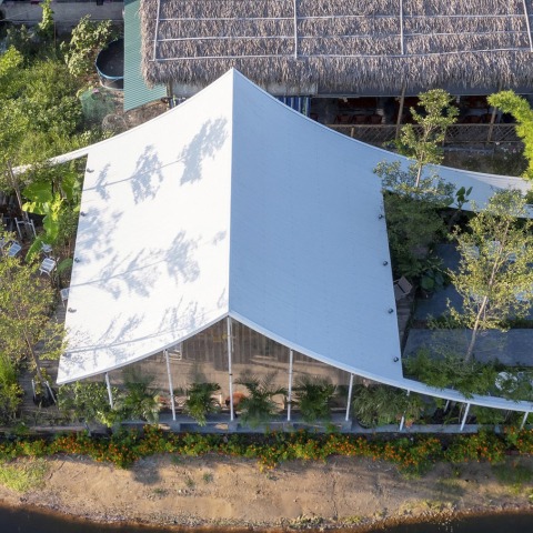 Para el techo se utilizan materiales de madera contrachapada reciclada y para decorar el espacio se utiliza leña comúnmente utilizada en la cocina local para hacerlo acogedor, rústico y amigable. Un espacio para tomar café al aire libre se distribuye en 2 áreas: patio delantero y patio trasero, brindando la atmósfera de una fiesta de café tipo picnic en la naturaleza. Además de la estructura principal del techo, el espacio se puede ampliar con sistemas de techo de lona adicionales para satisfacer las necesidades de uso flexibles.