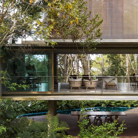 Para reducir el impacto en el suelo, se dejó libre la planta baja amorfa, cubierta con una tarima de madera que se remata con una piscina azul. Esta decisión protege la casa de la excesiva humedad de la selva y hace que la casa parezca flotar sobre el suelo de la selva. El paisajismo estuvo a cargo de Rodrigo Oliveira.