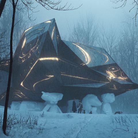 Convertir el arte de Melgaard en arquitectura es un proceso digital meticuloso. El trabajo consiste en dar forma a modelos digitales que consisten en un patrón triangular de pequeña escala. Los modelos Snøhetta seleccionaron los dibujos de Melgaard antes de iniciar un proceso de reducción de los modelos para lograr formas edificables. Una gran cantidad de triángulos se eliminan digitalmente del modelo 3D, creando un patrón más rugoso y geométrico. Las fachadas de la casa toman forma. La casa se ha convertido en una casa de madera física y triangular que descansa sobre postes de esculturas blancas en forma de animal. Por primera vez, el arte de Melgaard describe un espacio arquitectónico y una expresión.