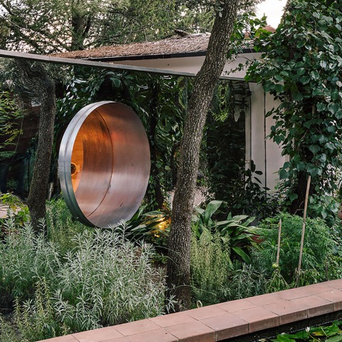 La casa como guarida, un lugar oculto, un escondite. Un reflejo que distorsiona, que amplia el jardín, que confunde y protege. No se acierta a ver el interior, un poco más adelante, aquí sí intuyo algo a través del gran óculo color plata que perfora el reflejo.